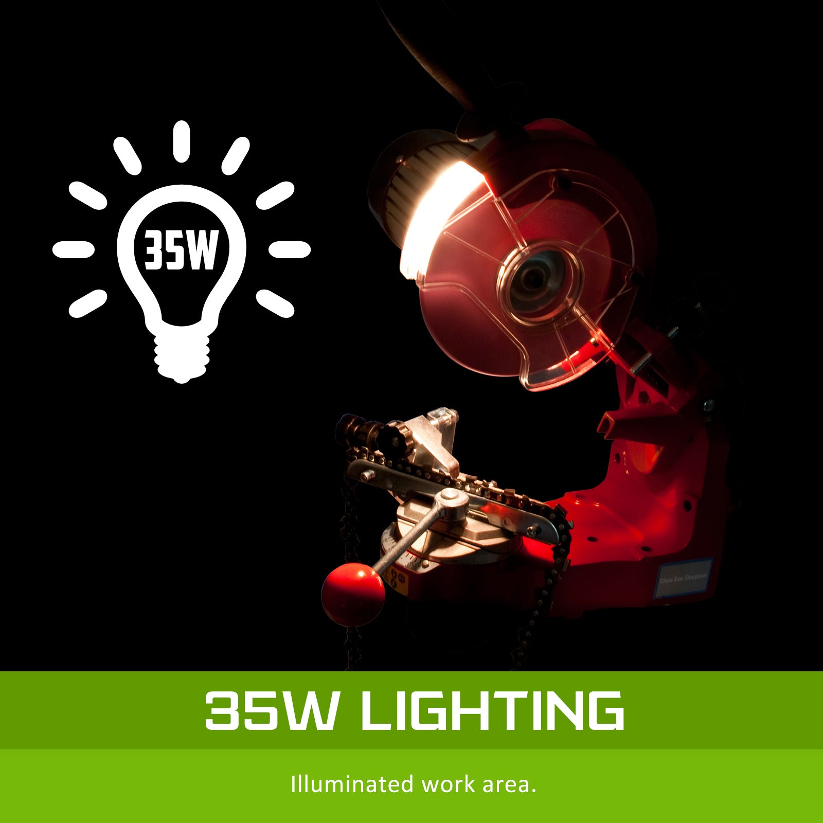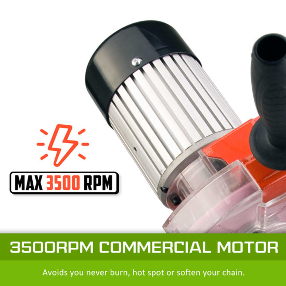 Powered by a 230W, 50Hz motor which peaks at 350W, grinds almost any chain type and size. The grinder also features a large transparent protective cover, operation handle, pre-drilled holes for bench mounting, an adjustable chain stop, two grinding wheels, max cutting length of 250mm, CAD designed all alloy chassis and a high torque alloy motor.