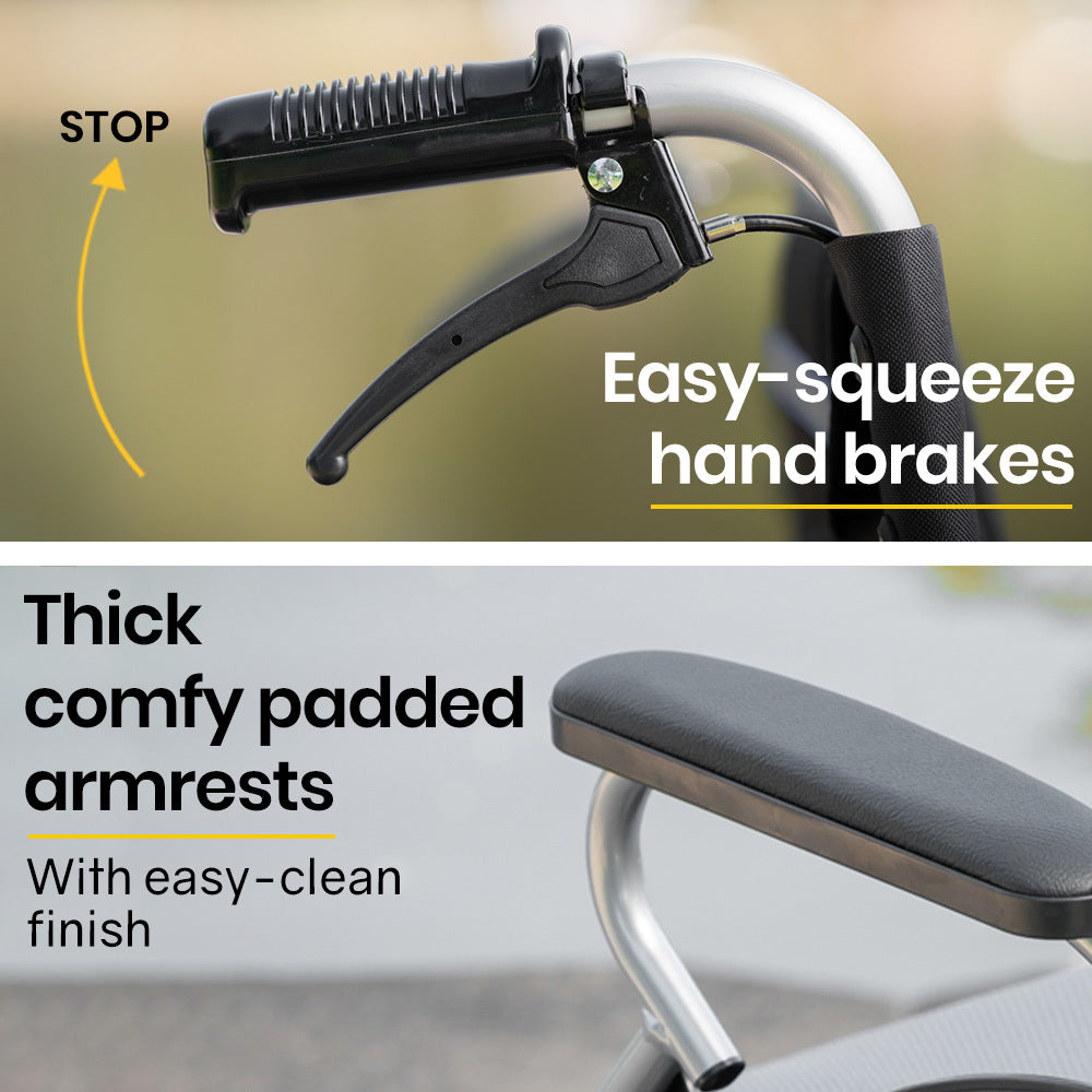 This premium lightweight wheelchair features fold up footrests allowing for access onto the wheelchair. The comfy padded seat and generously proportioned backrest ensure a comfortable ride. And, thanks to the 2 second folding action and ergonomic handles, it makes for a relaxing day out for any helpers, too! They can activate the easy access dual brakes to safely go down hills and ramps, while dual parking brakes can lock the wheels into position - a perfect time to pull out some reading material from the backrest pouch!