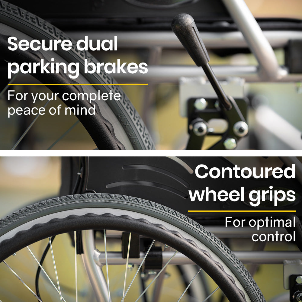 The large 20" rear tyres roll the wheelchair smoothly over the bumps on a range of surfaces. Not only that, they also offer the practicality of not requiring to be refilled with air and will never experience a puncture!