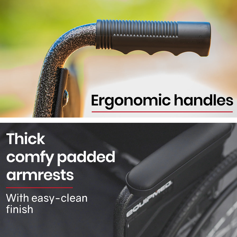 Activating the easy access park brake levers locks the wheels into position - a perfect time to pull out some reading material from the backrest pouch! This Equipmed Wheelchair certainly ticks all the boxes. Make the smart choice and enjoy well-deserved mobility!