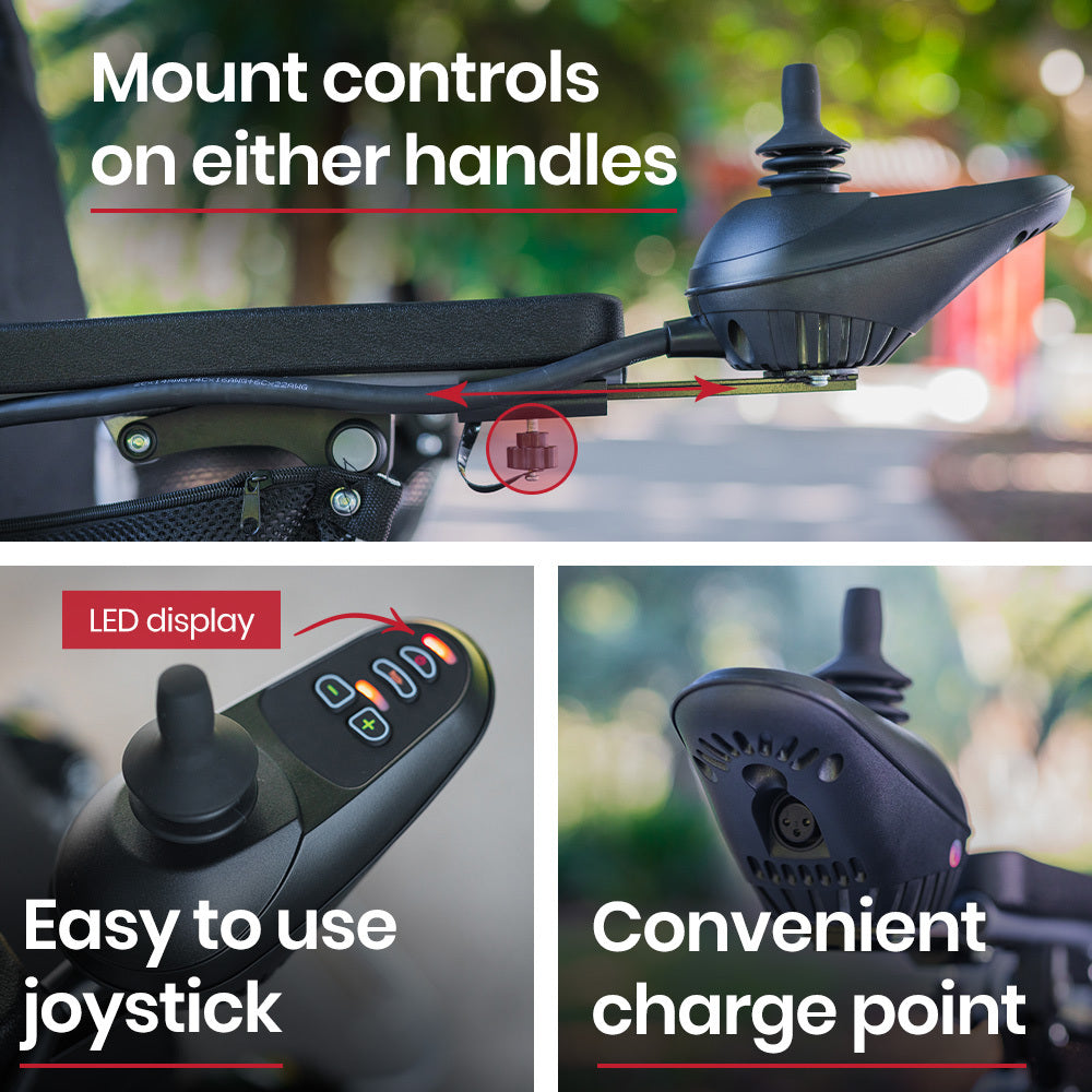 Steering is intuitive using the joystick that can be mounted on either the left or right-hand side, and with easy-to-read LED controls. You can travel along at a sensible speed of up to 6km/h, which is a brisk walking pace.