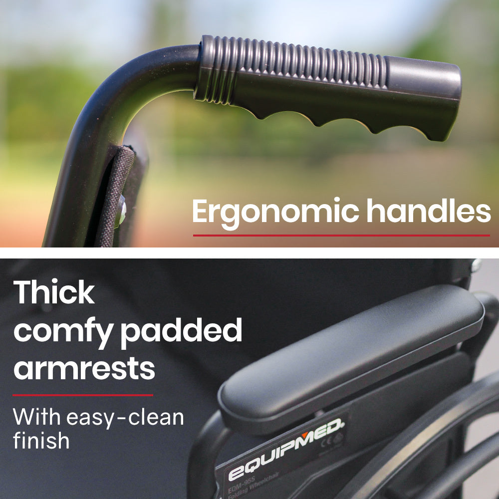 This Equimed wheel chair features height adjustable footrests that also swing out for easy access onto the wheel chair. Comfy padded armrests and a padded seat with generously proportioned backrest ensure a comfortable ride. The armrests have quick release levers which allow them to swing back to allow for convenient access at tables when dining. And, thanks to the 2 second folding action and ergonomic handles, it makes for a relaxing day out for any helpers, too!