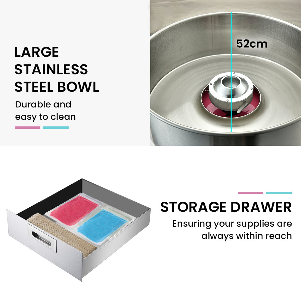 With the universal appeal of fairy floss, it’s an easy sell at community events, fairs, and markets. With its robust design and simple operation it’s also an option to hire it out for kids parties. The Eurochef has all the features you need. The handy storage drawer ensures that your supplies are always within reach. Its fast spinning head holds a generous 114 grams of floss sugar so you can avoid frequent refilling, and its removable stainless steel bowl makes cleaning and maintenance easy at the end of the day. Secure safety latches and rubber feet keep the bowl and machine securely in place to minimise vibration!