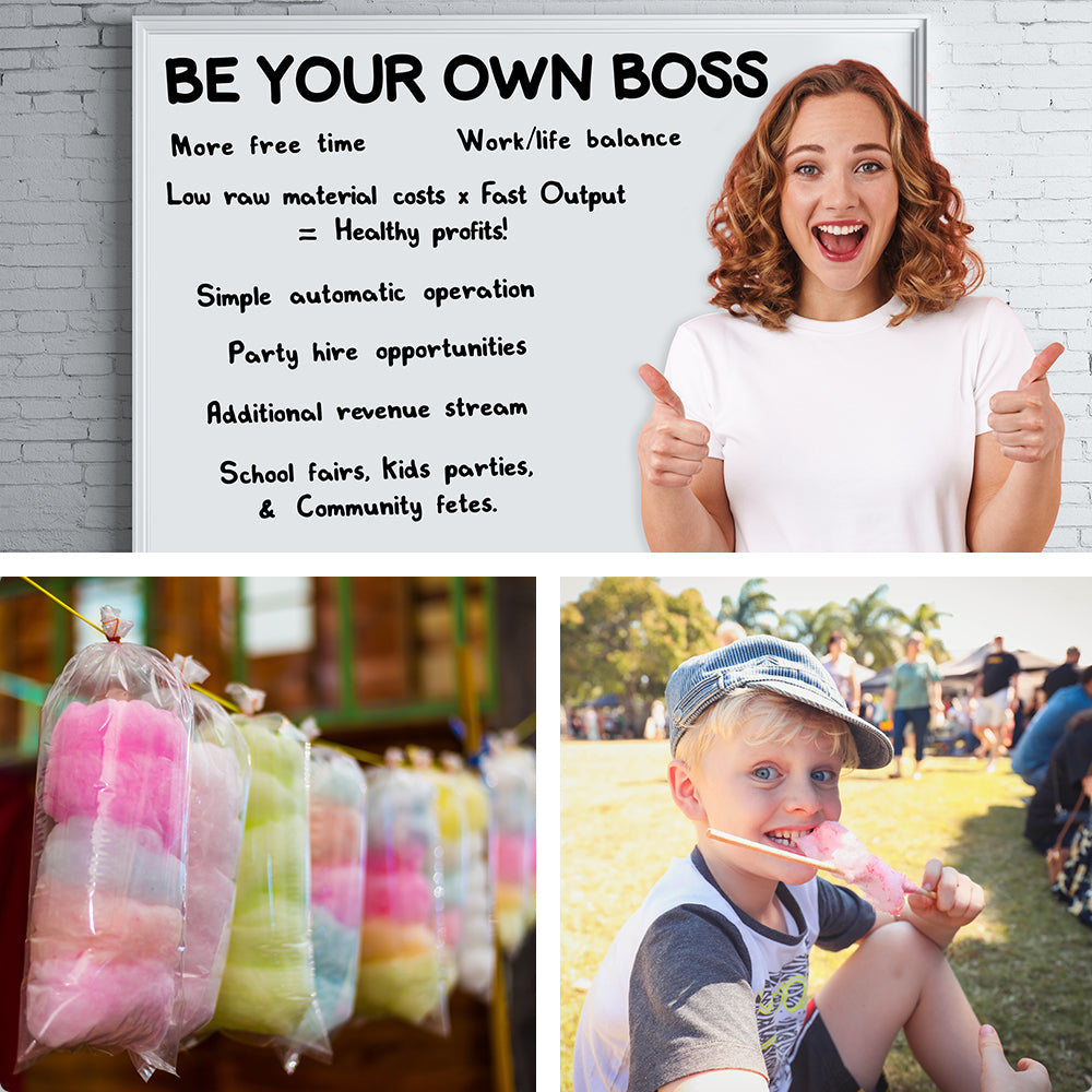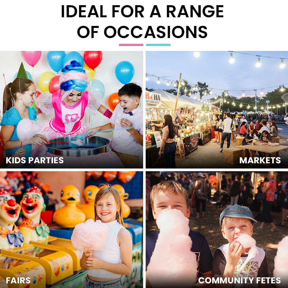 If you’re looking for a lucrative and fun way to increase your income then look no further! This commercial-grade machine features a large 52cm diameter stainless steel bowl and is equipped with a powerful and reliable 1000W motor that delivers whisper-quiet operation and produces up to 6 delicious servings of consistently fluffy floss a minute. This versatile machine gives you the option of using traditional floss sugar or transforming any of your favourite hard candies into fluffy fairy floss!