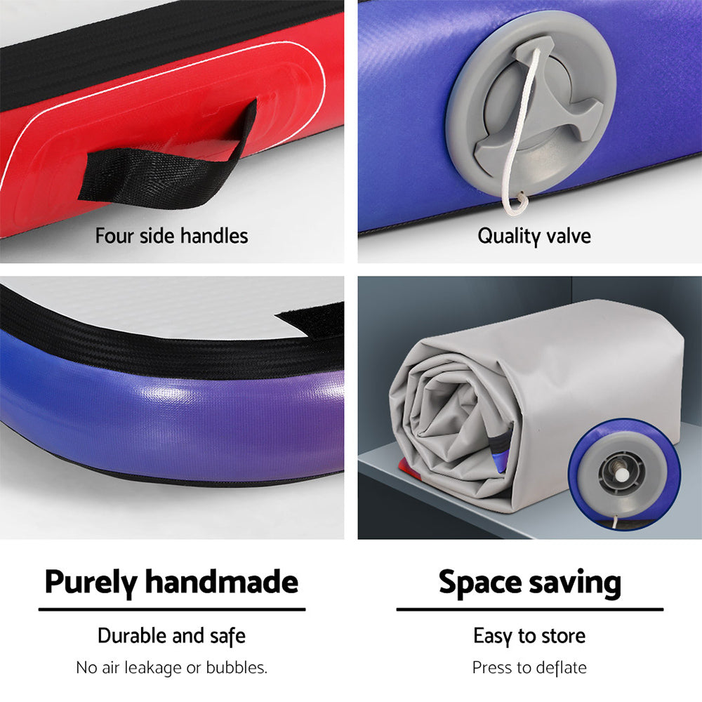 Perfect for gymnastics, cheerleading, martial arts and other school sports, our Everfit inflatable Air Track is a great training and competition landing platform that ensures safe and durable use. Softer on the body than foam, the 10cm thick air track mat is also bouncier than a spring floor and highly versatile. It features 1000-denier double-wall fabric construction with an anti-slip and wear-resistant surface. Designed for robust use, the air track mat does not twist or bend with constant handling and helps to reduce impact readily and significantly. Great for indoor or outdoor use, the 3m air track mat comes with four carry handles and a built-in valve for easy inflating and deflating. Storage is just as easy as well as space saving too.
