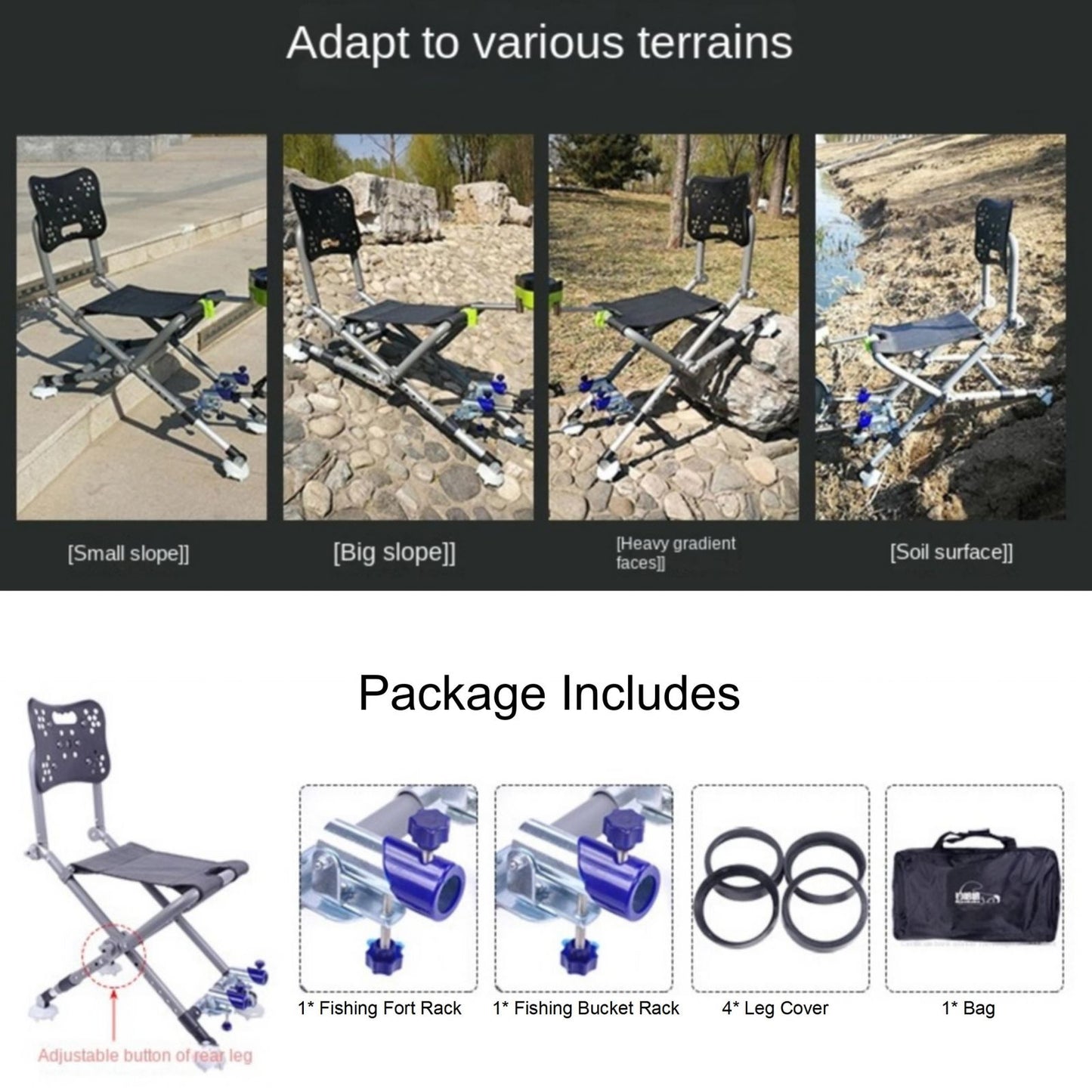 Adjustable Legs and Backrest Fit for All Terrains: This fishing chair has 180 degree adjustable backrest to suit your needs, also the legs are back legs can adjust slope to fit all terrains. it can be used at rock shore, stairs, and sand shore, also can be use as a folding fishing chair, which is very suitable for outdoor activities such as fishing, camping, hiking, etc.