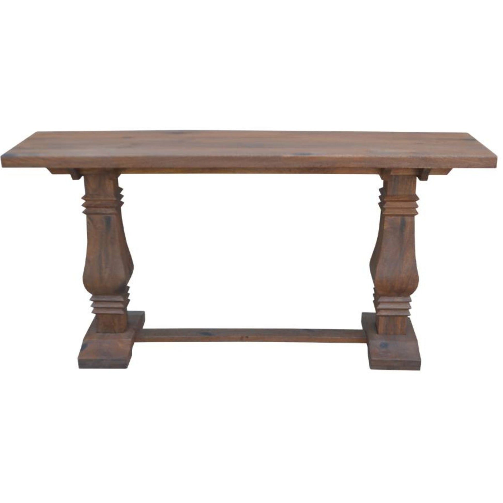 This smart-looking console table in French provincial style is simply a visual feast. It is a splendid work of wood art, crafted by using the traditional construction of wood. The table features intricately carved legs for a touch of grandeur. The robust legs blend in with any interior decor style. The lavish console table is made of sustainably harvested mango wood with naturally occurring wood patterns. They give it an excellent look. The wood is known for its beauty, low maintenance, and high durability. The table in antique walnut colour looks even greater with a sandblast distressed finish. A one-year warranty is included with the simple-to-assemble console table.