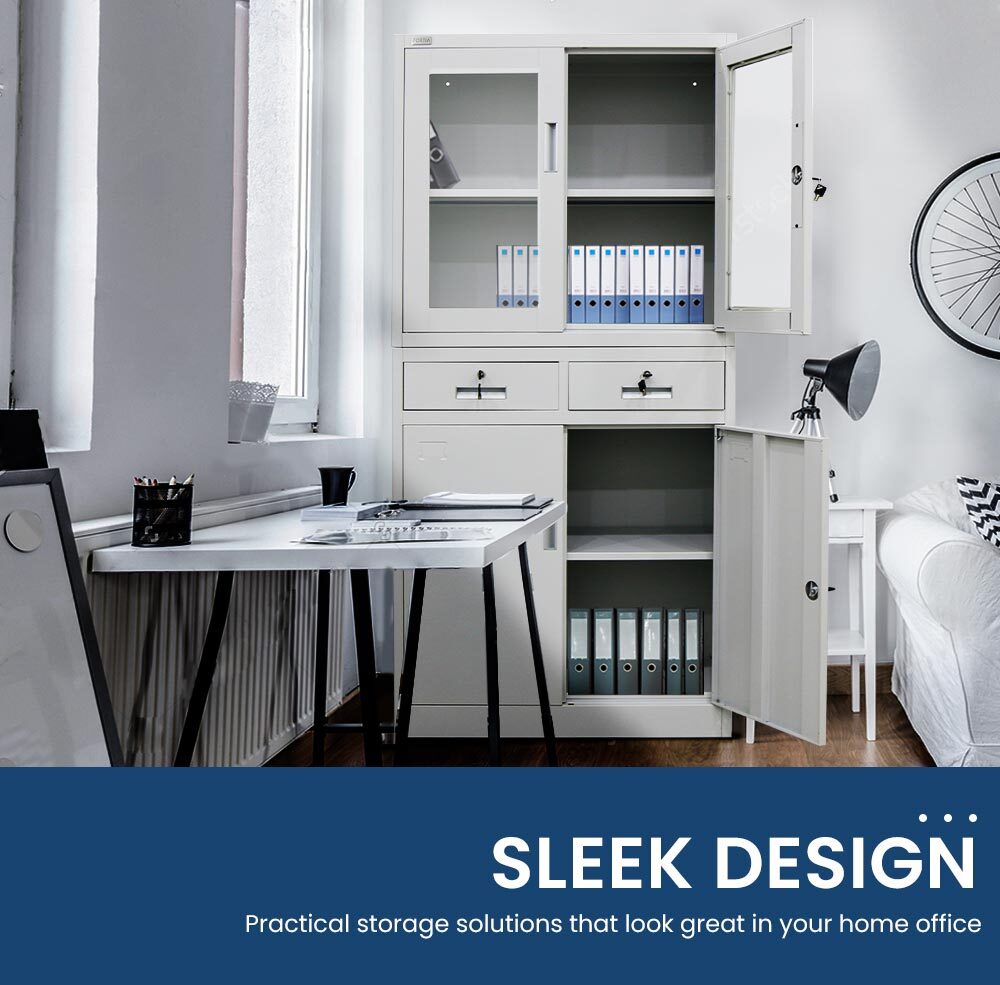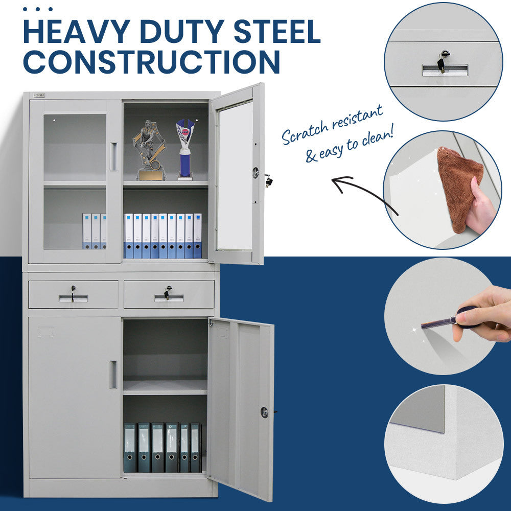 FORTIA 4-Door Lockable Steel Stationery Storage Cabinet, Display Windows, 2 Drawers, Grey