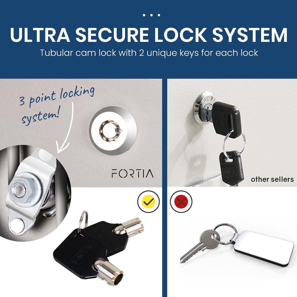 Unlike others on the market, the FORTIA system features a superior tubular cam-lock system. Every lock comes with 2 compatible keys, and the internal shelving is easily adjustable to suit your needs.