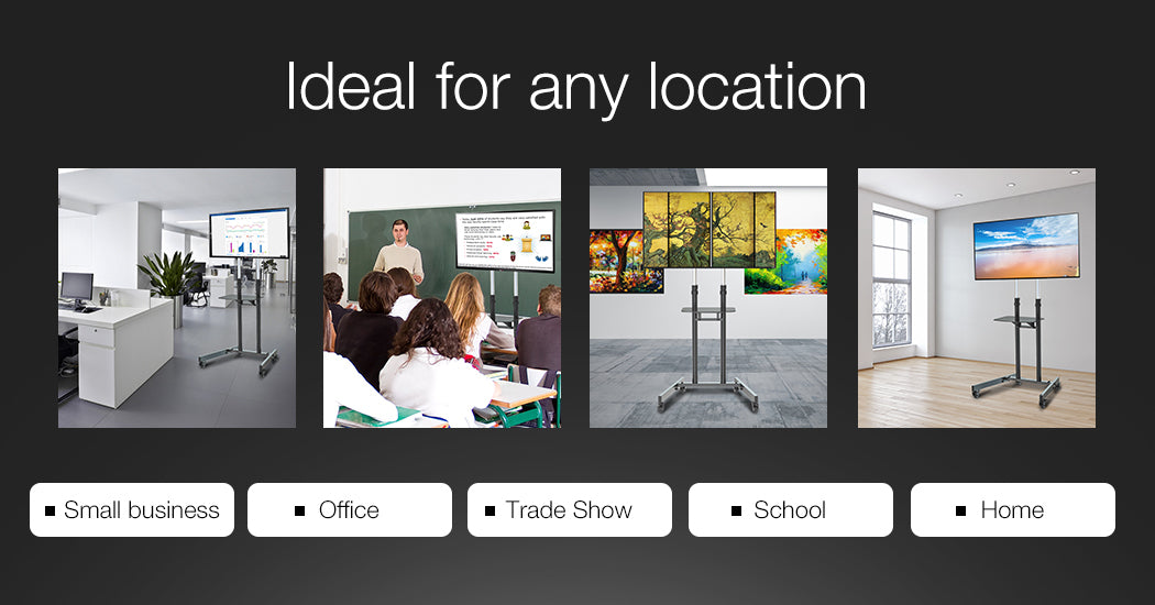 The FORTIA Heavy-Duty Mobile TV Stand is designed with convenience and durability in mind, and is ideal for use in a variety of settings. Whether you need a convenient stand for your office, school, small business, trade show, conference presentation, or home, it fits seamlessly into any environment and allows you to create a more organised and ergonomic viewing experience.