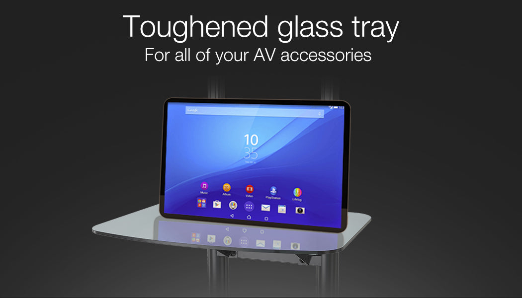 Made with a sturdy steel frame with long legs and a max load of up to 68kg, you can mount your TV screen with complete confidence. It includes an integrated level for precise set up, and a convenient toughened glass tray which you can use to house a media playback source. Set on easily movable castor wheels you can easily relocate your TV screen to any room or location. Once in position you can secure into place simply by activating the castor locks with the press of your foot.