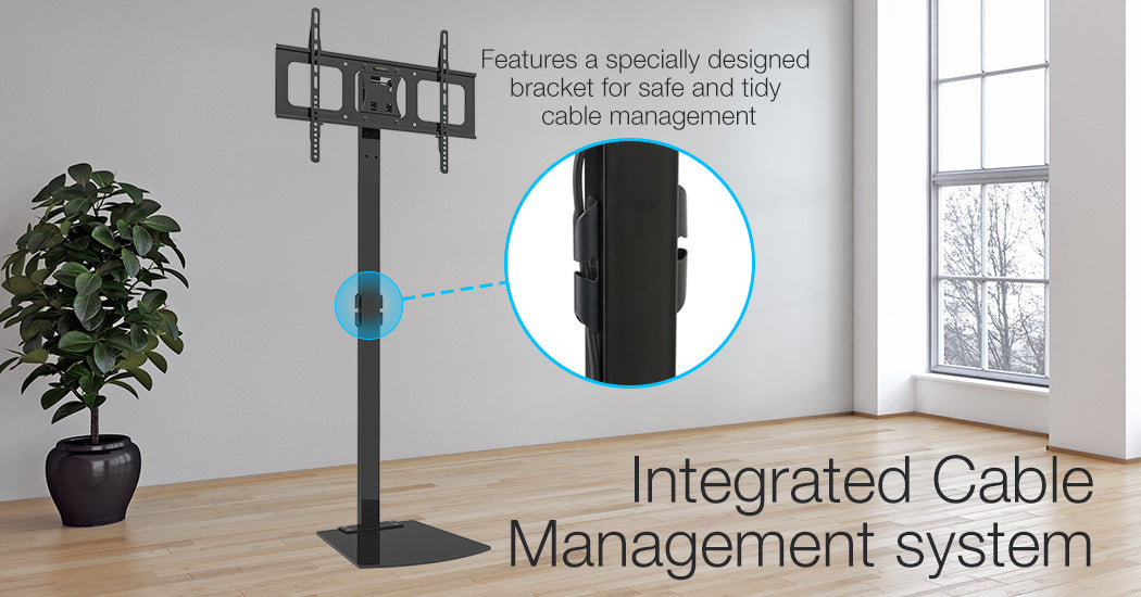 You can mount your television screen with complete confidence thanks to the sturdy steel frame that can hold up to 45kgs, and large rubber feet on the base. The modern and stylish design allows you to integrate your TV screen with the rest of your multimedia system. Brackets along the stand facilitate cable management for a tidy appearance and safe environment.
