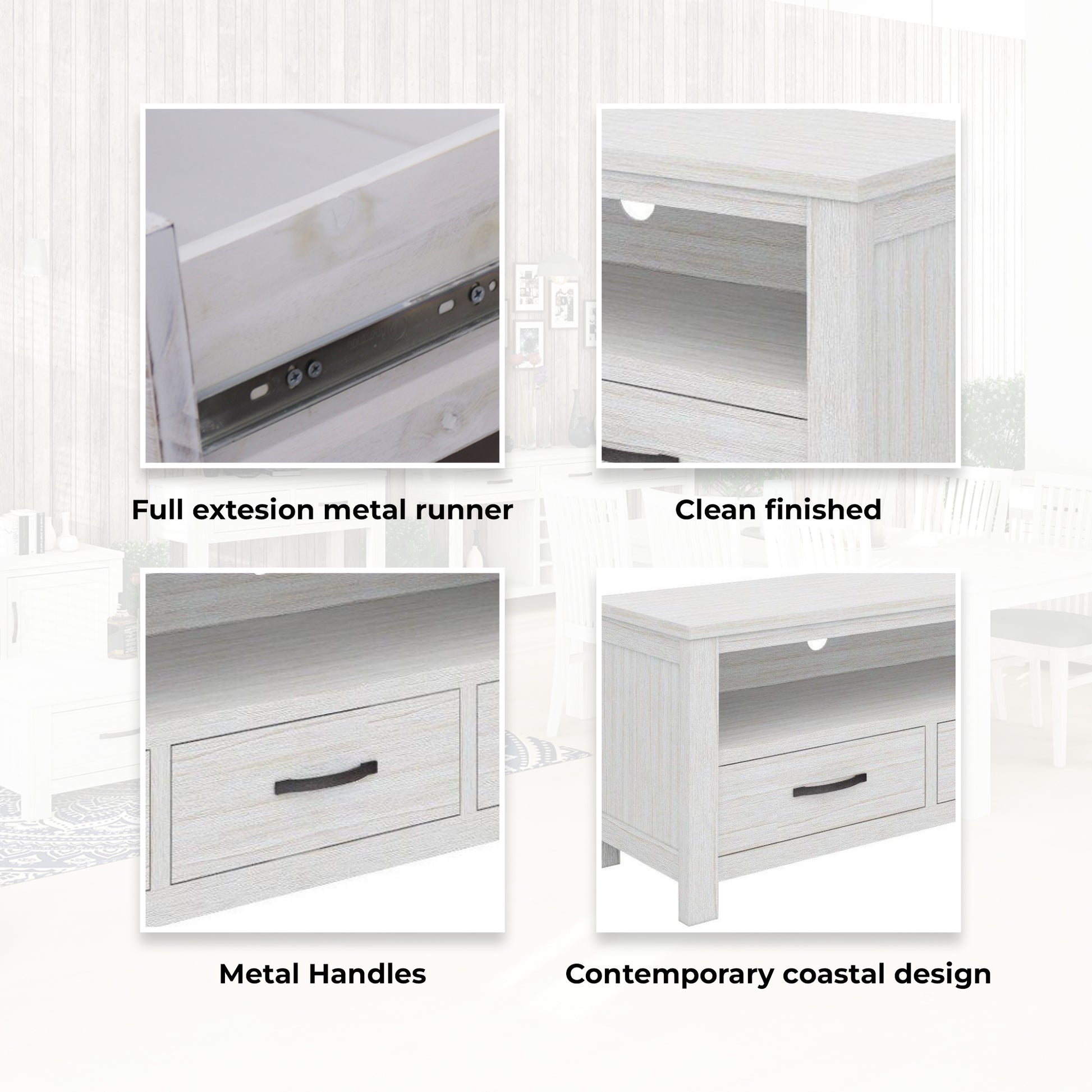 An entertainment unit is the real charm of a living room. Get yourself a lovely ETU and realize this. This slim design TV unit, designed in the coastal style, with 3 drawers and 1 large niche with 2 cable holes will make your living area vibrant. Pretty in its appearance, this lovely furniture piece features a strong structure of mountain ash wood, obtained in a sustainable manner. The wood is known for its attractive looks, great strength, shock-resistance, durability, and ease of maintenance. The sizable drawers have full extension metal runners. Smooth-on-touch metal handles with an antiqued finish adorn all drawers. The ETU goes well with a range of decor types because it is in Brushed White Wash finish. The fully assembled buffet comes with a one-year warranty.