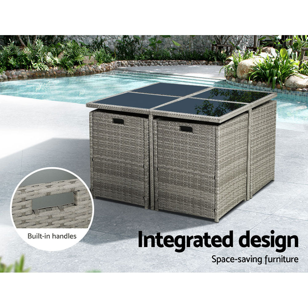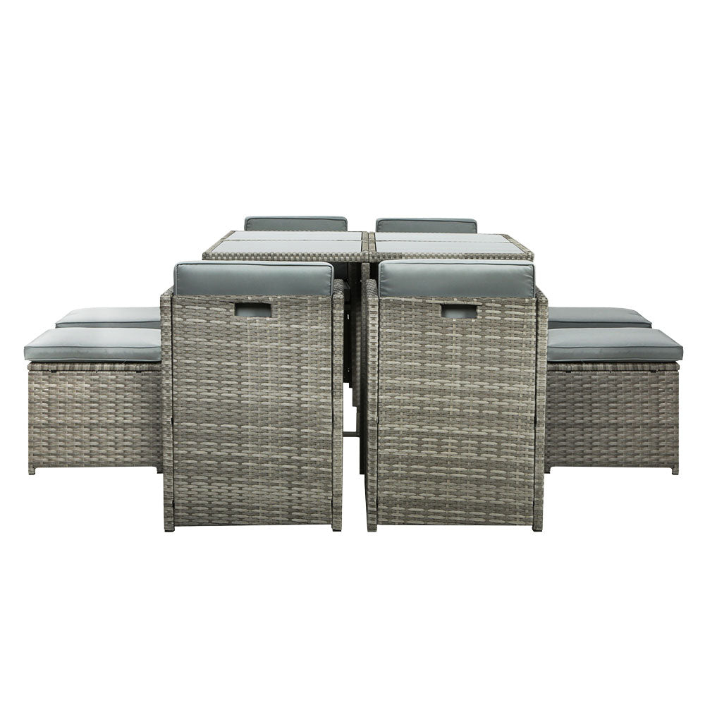 Looking to create a chic and gorgeous outdoor dining setting? The Gardeon 8-seater wicker outdoor dining set is a must purchase. It will liven up your outdoor space and help you achieve an elegant space where you can enjoy day and night and summer and winter. This 9-piece set comprises of four chairs, four ottomans, and a large table. It boasts an integrated design that helps save space. The ottomans can be pushed under the chairs when not needed. All the seat and back cushions come with thick, high-density soft padding that ensures your comfort always. Additionally, the removable cushion covers are water-resistant to suit different seasons. Furthermore, our outdoor set features a lovely wicker weave for a touch of tropical charm, and the UV-resistant PE wicker with weather-resistant steel frame is suitable for all-season use. The large table with thick tempered glass top, durable frame, and stable cross construction ensures strength, durability, and stability. This set also comes with a bonus water-resistant storage cover that offer protection from all seasons. Our wicker outdoor dining set will withstand the test of time. You can create a praise-worthy spot with just a little creativity that will wow your guests. Shop it for your home today.