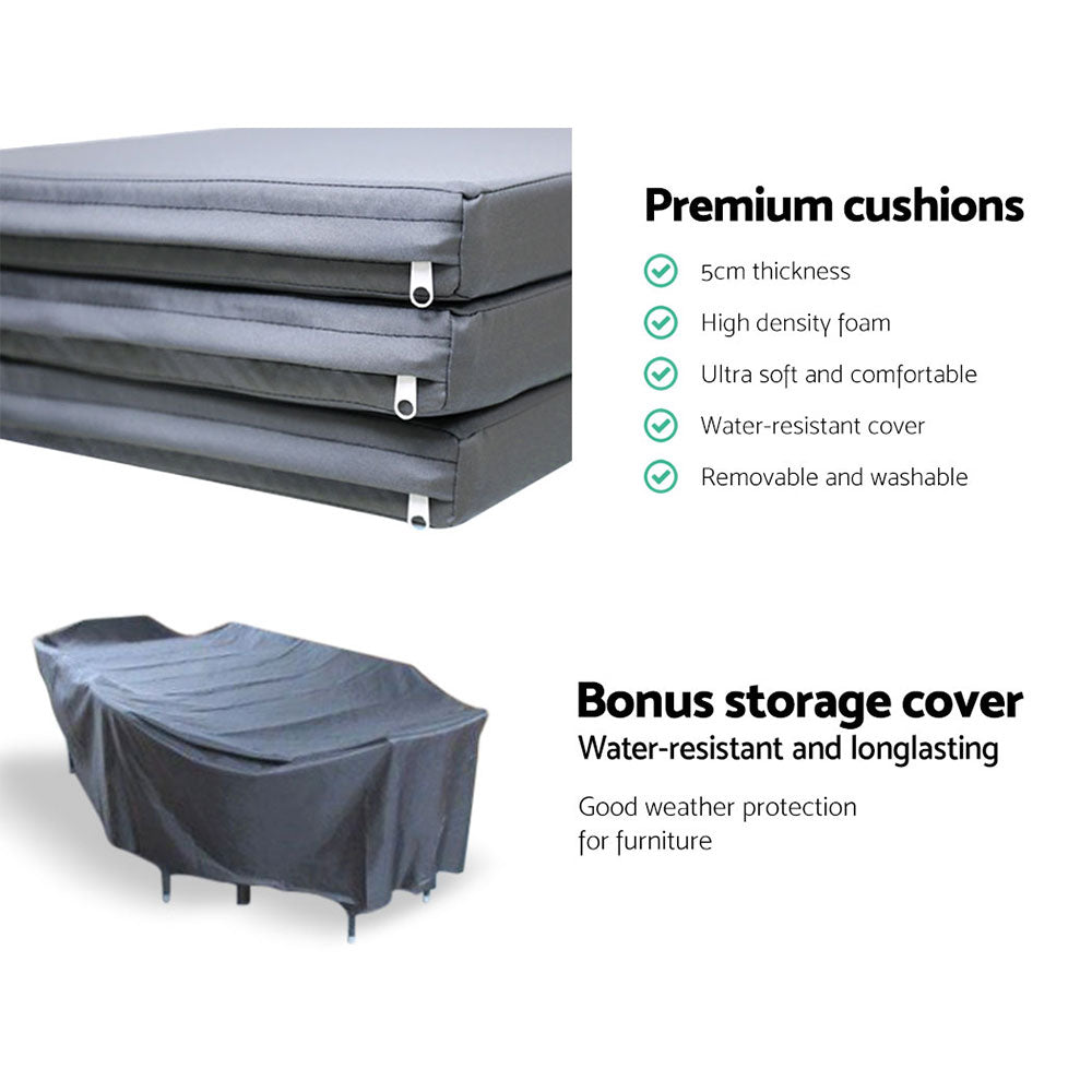 Dine in exquisite style with our elegant Gardeon Outdoor Dining Set. Finished in UV-resistant PE rattan with a strong and sturdy aluminium frame construction for both chairs and table, this multi-piece dining set is designed to please as well as stand up to the weather elements. The chairs have a sleek and contoured profile with 5cm thick high density foam cushions to ensure comfort and style are always in place. And the spacious dining table features a 5mm thick tempered glass top for safe and hardy use. Not least, a water-resistant cover for the entire ensemble is also included to keep it clean always.