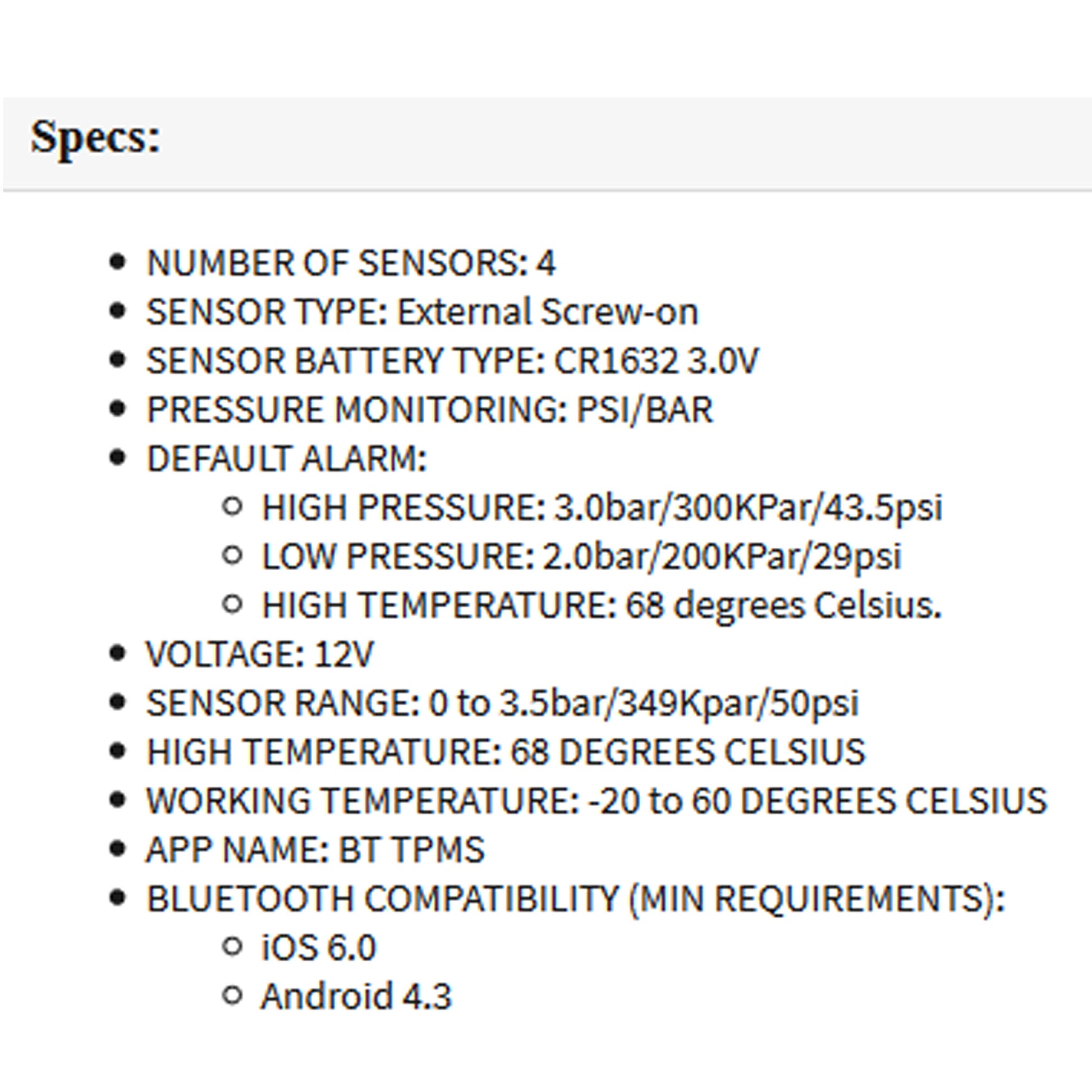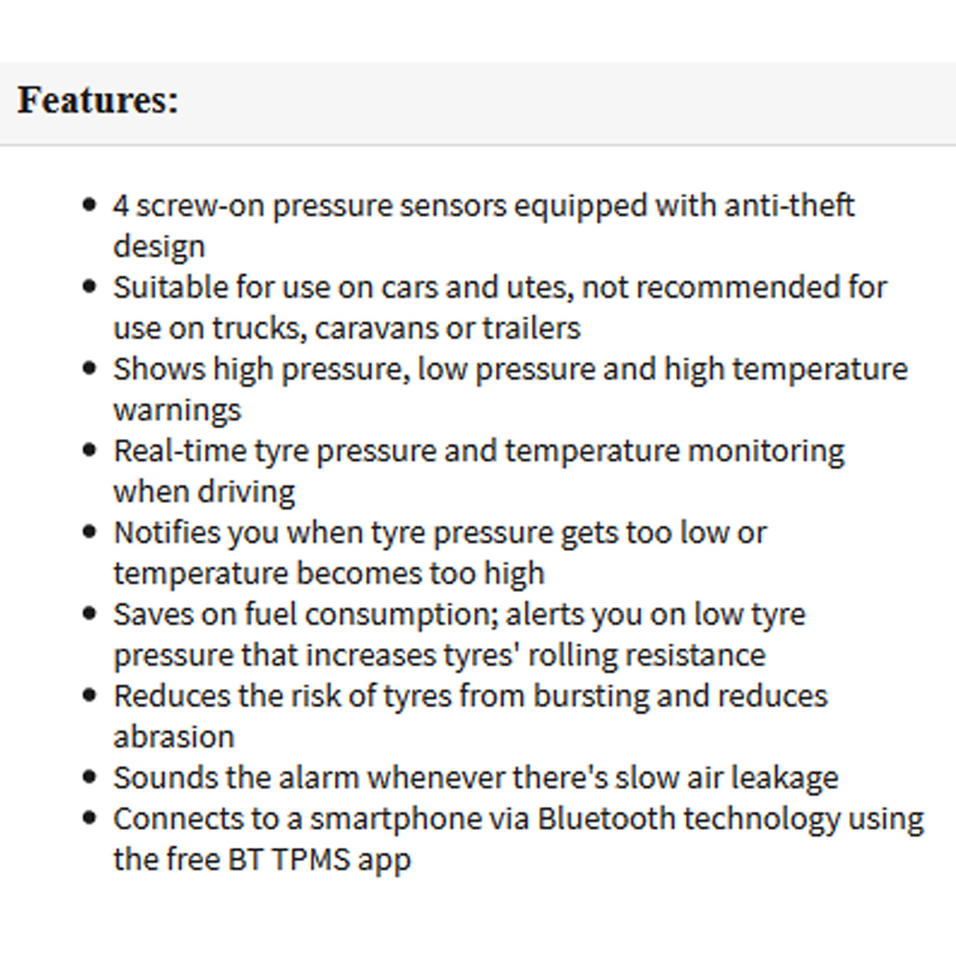 Suitable for use on cars, vans and utes, not recommended for Trucks, Caravans or Trailers. (Max pressure for sensors is 50psi)