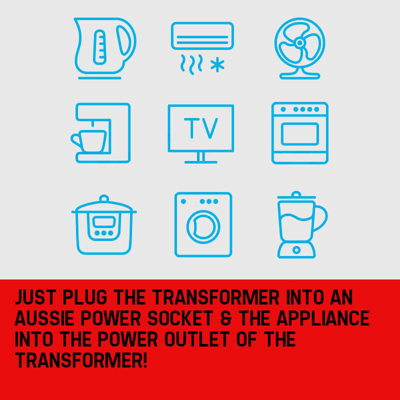 The GENPOWER GSD1000 converts alternating current (AC) 240 volts into 110 volts to allow your US appliance to run in Australia. Just plug the transformer into an Aussie power socket & the appliance into the power outlet of the transformer!