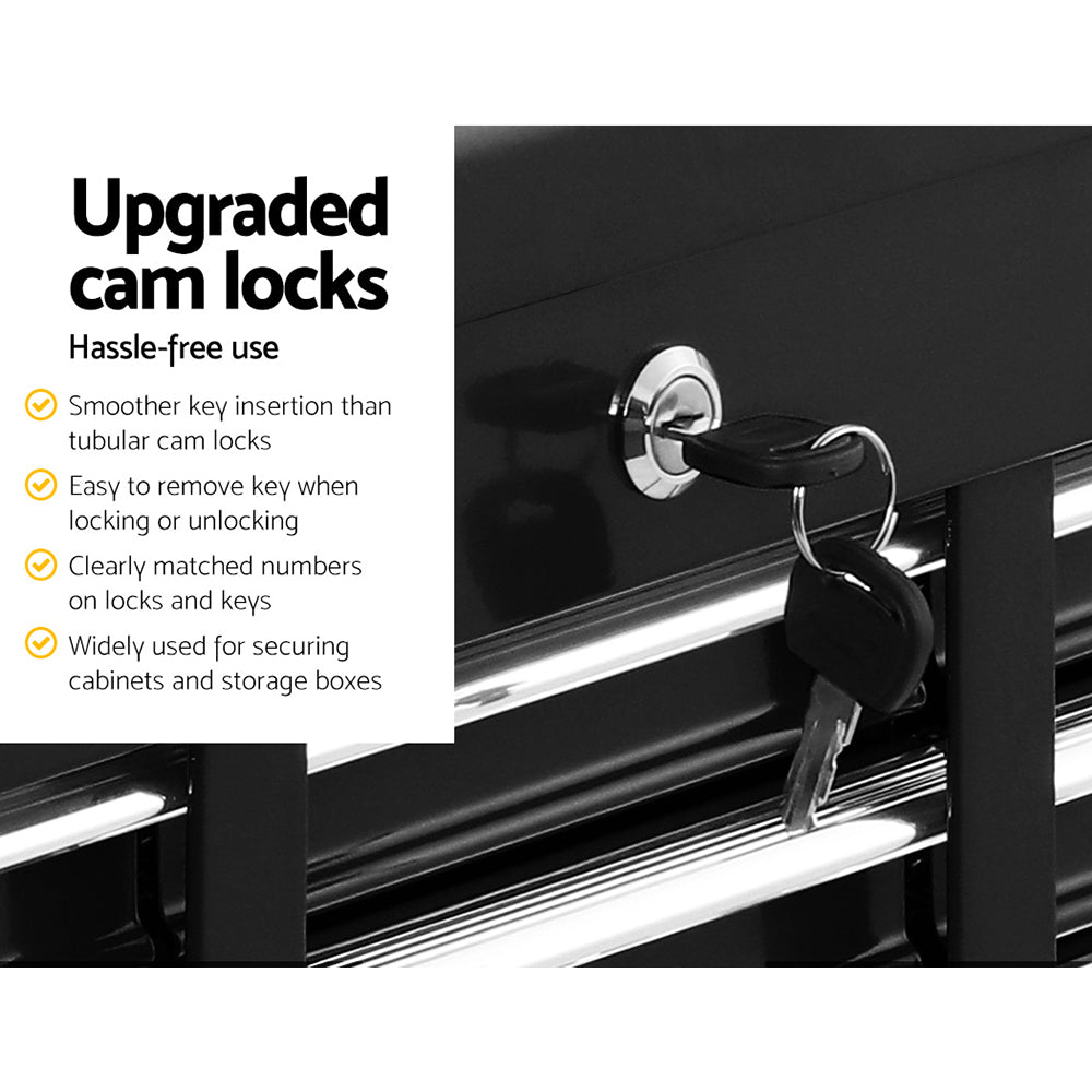 Made from high tensile powder-coated steel, the Giantz Tool Chest and Trolley is built to keep your precious tools in their proper place with drawers that are specifically designed to cater to various tool sizes. Comprising 15 drawers, with a 9-drawer chest and 6-drawer trolley, each drawer slides in and out effortlessly on quality ball bearings incorporated into the metal drawer runners. Each drawer is also lined with a gripped EVA pad to protect your tools and keep them from moving about. Better still, the set is installed with upgrade cam locks that are more reliable and secured compared to general locks. They also feature sturdy oval-shape handles that provide full grip and smooth handling. Not least, this heavy-duty ensemble is installed with four castor wheels with two that have brakes for easy mobility and fast standing.