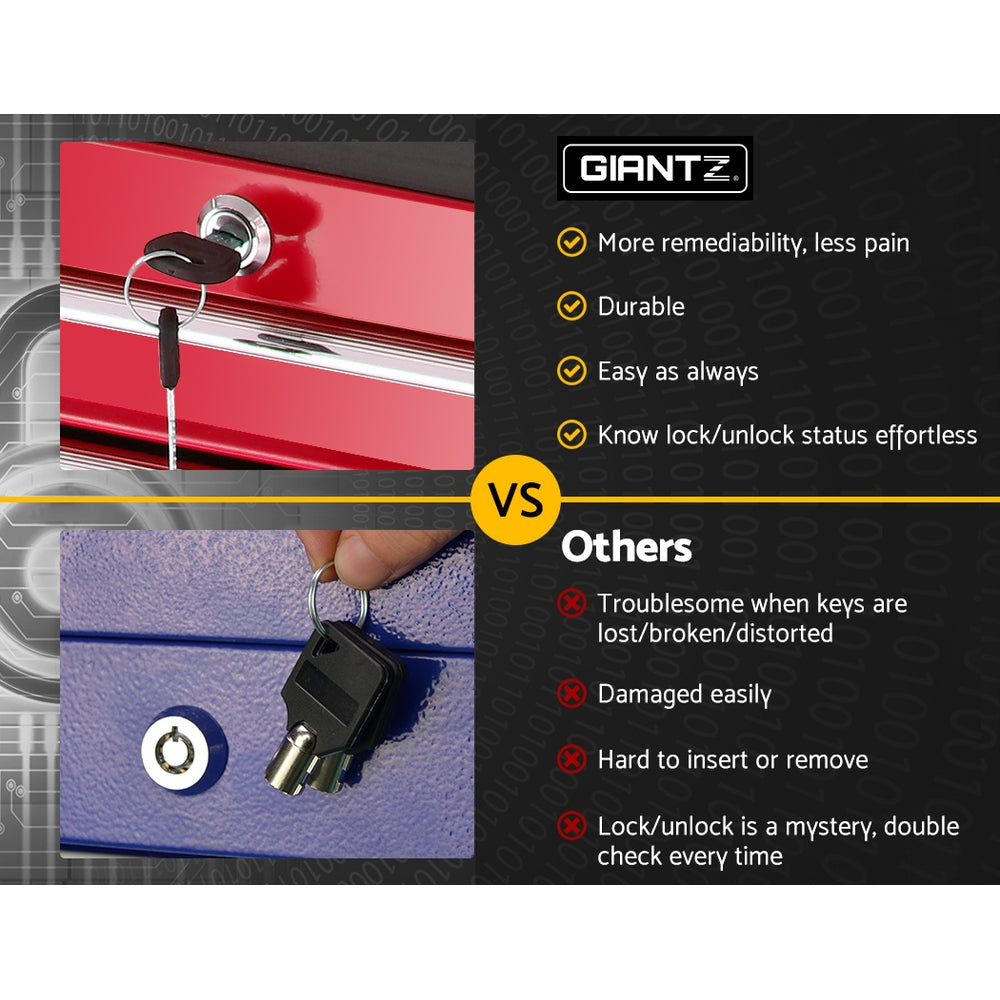 The item comes with a side handle and castors for mobility. Keep all the tools you need in reachable range. All the drawers are fully lockable which is more reliable to keep your tools in safety!