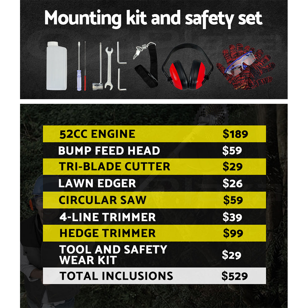 Giantz 62CC Pole Chainsaw Petrol 7 In 1 Brush Cutter Whipper Snipper Multi Tools
