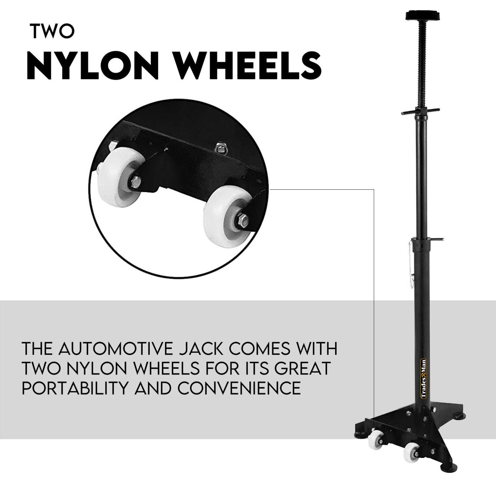 The tripod jack stand's height can be adjusted by holes in the column, and the spin handle. It also comes with two nylon wheels for its great portability and convenience.