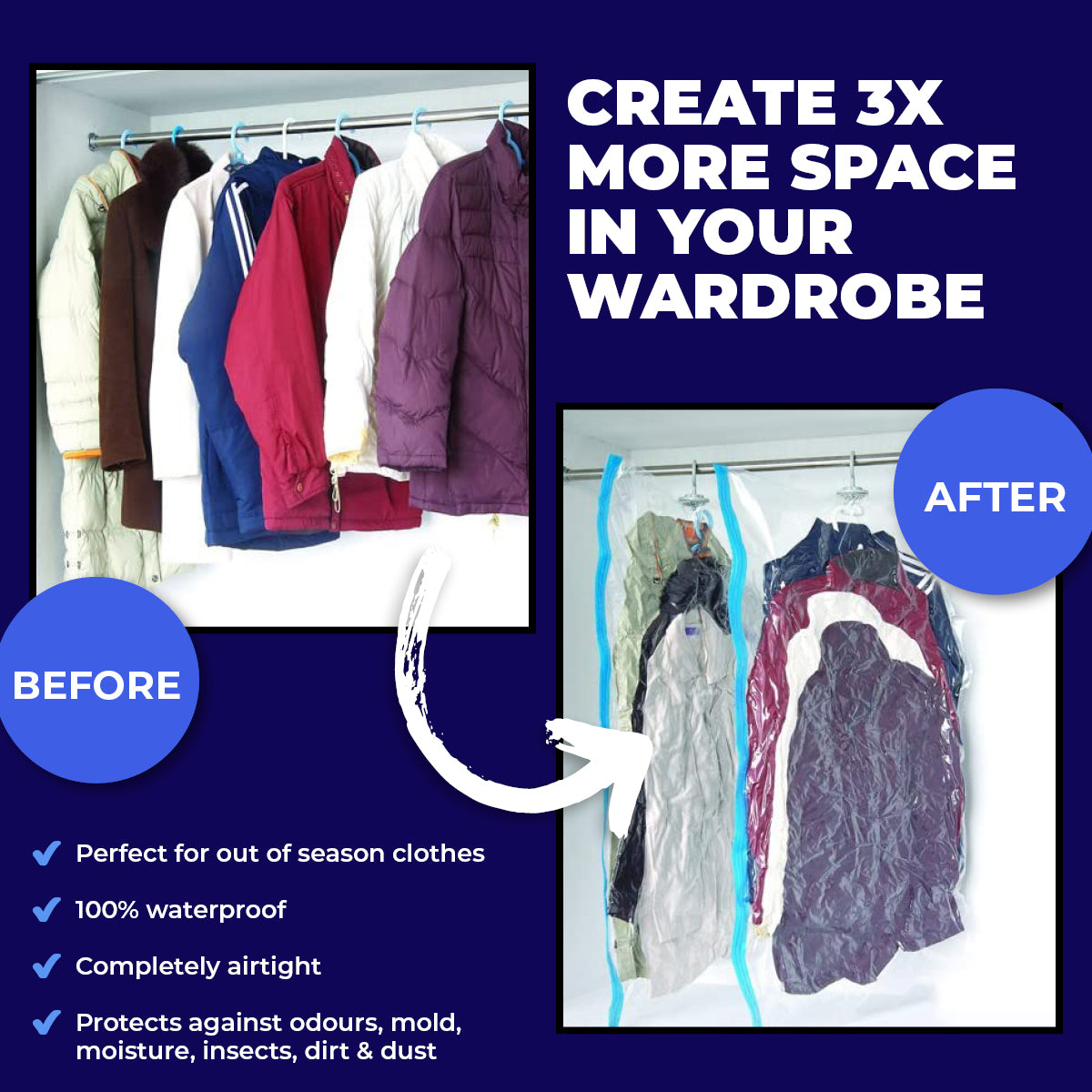 Home Master� These hanging vacuum storage bags are great to store away bulky items of clothing. Increase your storage space and protect your bulky and seasonal garments from odour, mould, moisture, insects, dirt and dust. You will be amazed at the amount of space you save using these vacuum bags.