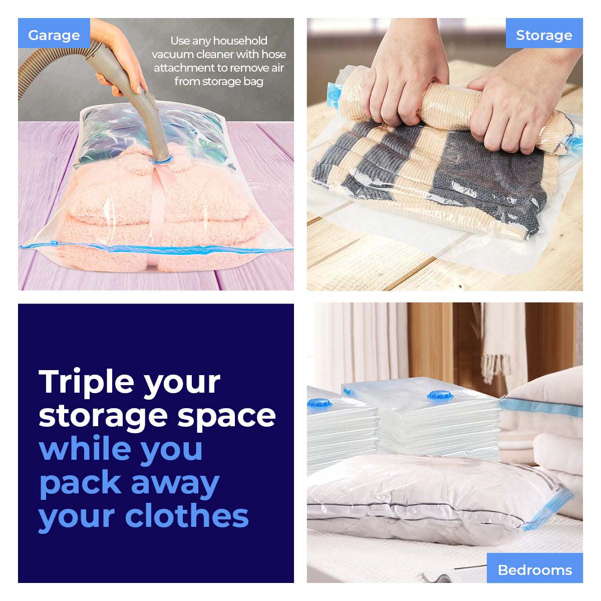 Home Master� Store away seasonal clothing and items using these vacuum storage bags. Re-usable and airtight, they are a definite space saver. Each bag has a solid vacuum cap and a air lock clasp. Once ready, these bags containing your belongings can be stored anywhere within your home. Protect your belongings from odours, mildew, moisture, insects, dirt and dust when not in use.