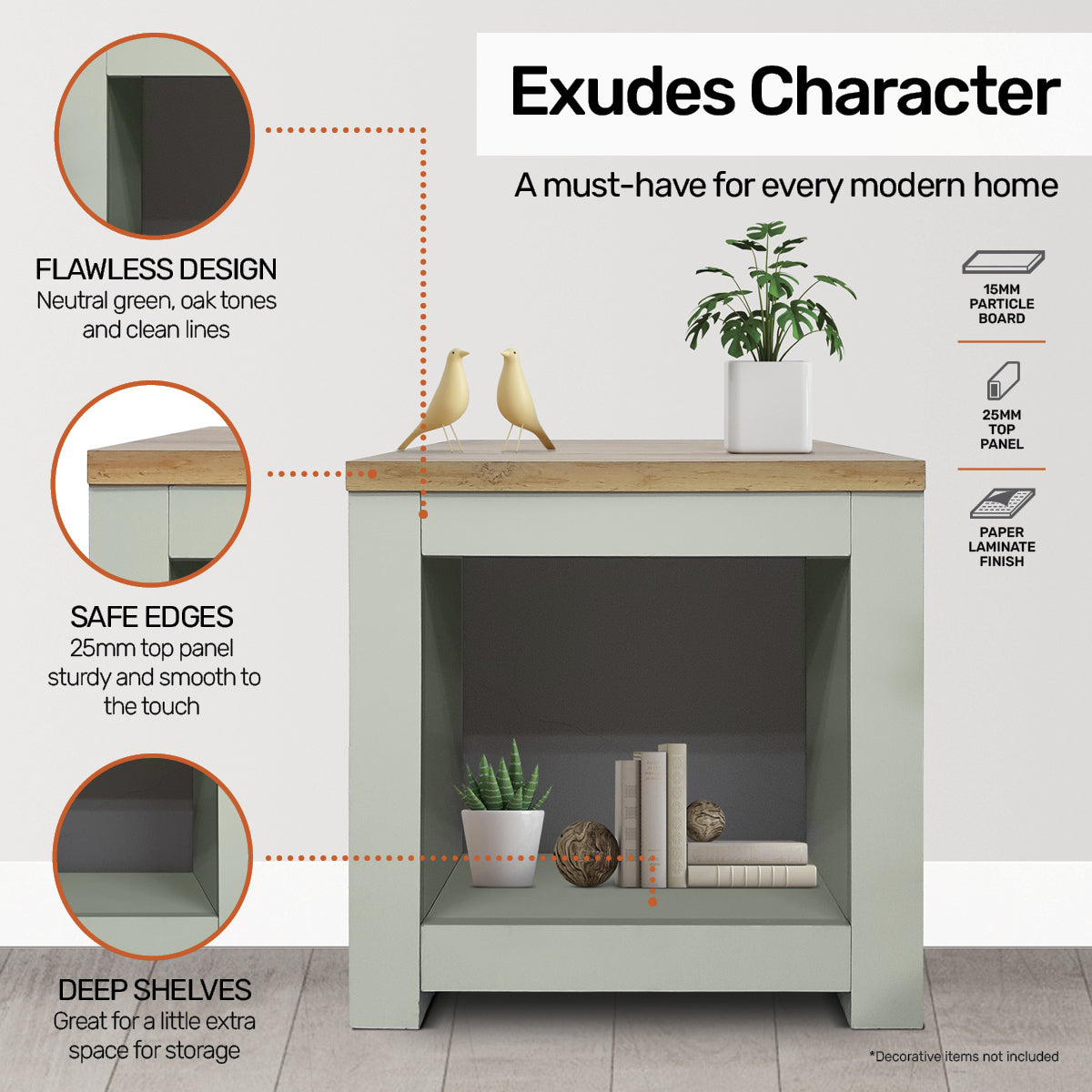 Home Master� With a flawless two tone design of oak and neutral green, this unique side table boasts a spacious shelving base. Ideal for decorative items, books or magazines. With smooth and sturdy panelling, clean lines and an impressive finish this is a stylish and timeless side table that is sure to compliment your home.