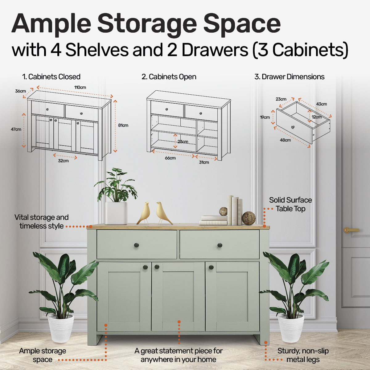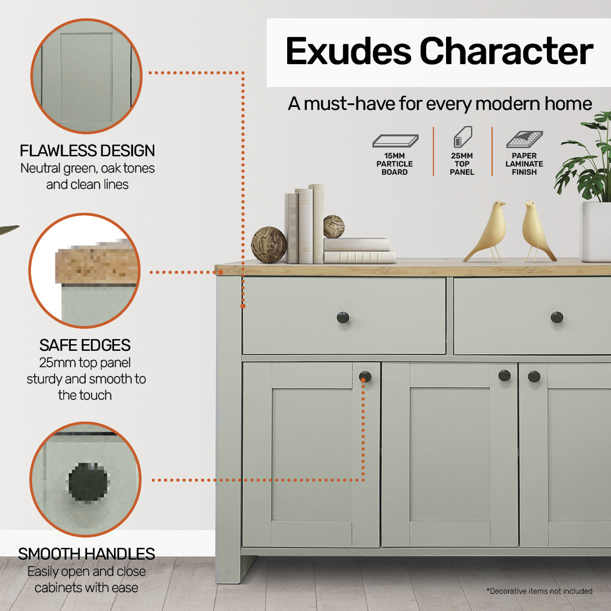 Home Master� With a flawless two tone design of oak and neutral green, this sideboard boasts spacious cabinets and drawers, with smooth and sturdy panelling, clean lines and an impressive finish. A stylish and timeless sideboard that is sure to compliment your home.