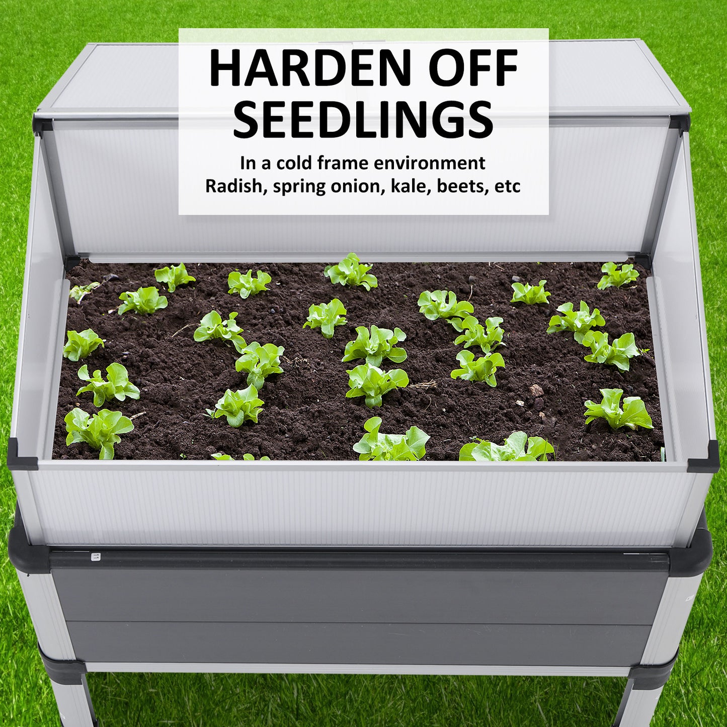 Thanks to the height of a raised garden bed, gardeners appreciate the comfortable ergonomics of raised beds over in-ground planting, less bending over to pull weeds. Also, the PVC cover creates a greenhouse / cold frame function, protecting delicate plants from cold, wind, and sun, allows the gardener to lengthen the garden season.