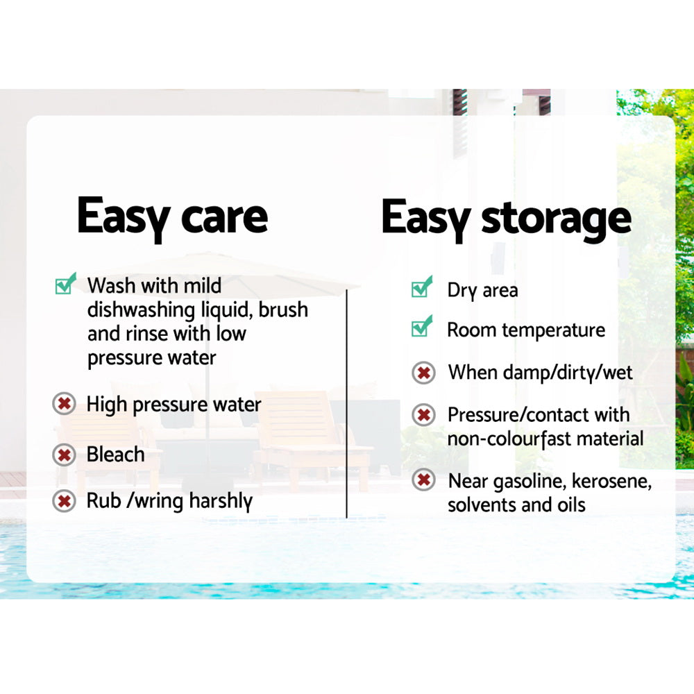 Time to go out and enjoy the good weather with an Instahut Outdoor Umbrella. With high-quality water and UV resistant polyester fabric and durable steel construction, the Instahut Outdoor Umbrella will last you through all seasons. With a 3m diameter, the umbrella offers plenty of coverage for your table, friends and family. The tilt function allows you to adjust the shade according to the sun's position, while the fail-safe crank system and 8 steel support ribs make it easy to open and close as needed. Use the umbrella anywhere from the beach to the back patio. It's even easier to maintain – just wash with low pressure water and mild dishwashing liquid, and store in a cool, dry place when not in use. It's that simple! For the easiest summer protection, choose an Instahut Outdoor Umbrella.