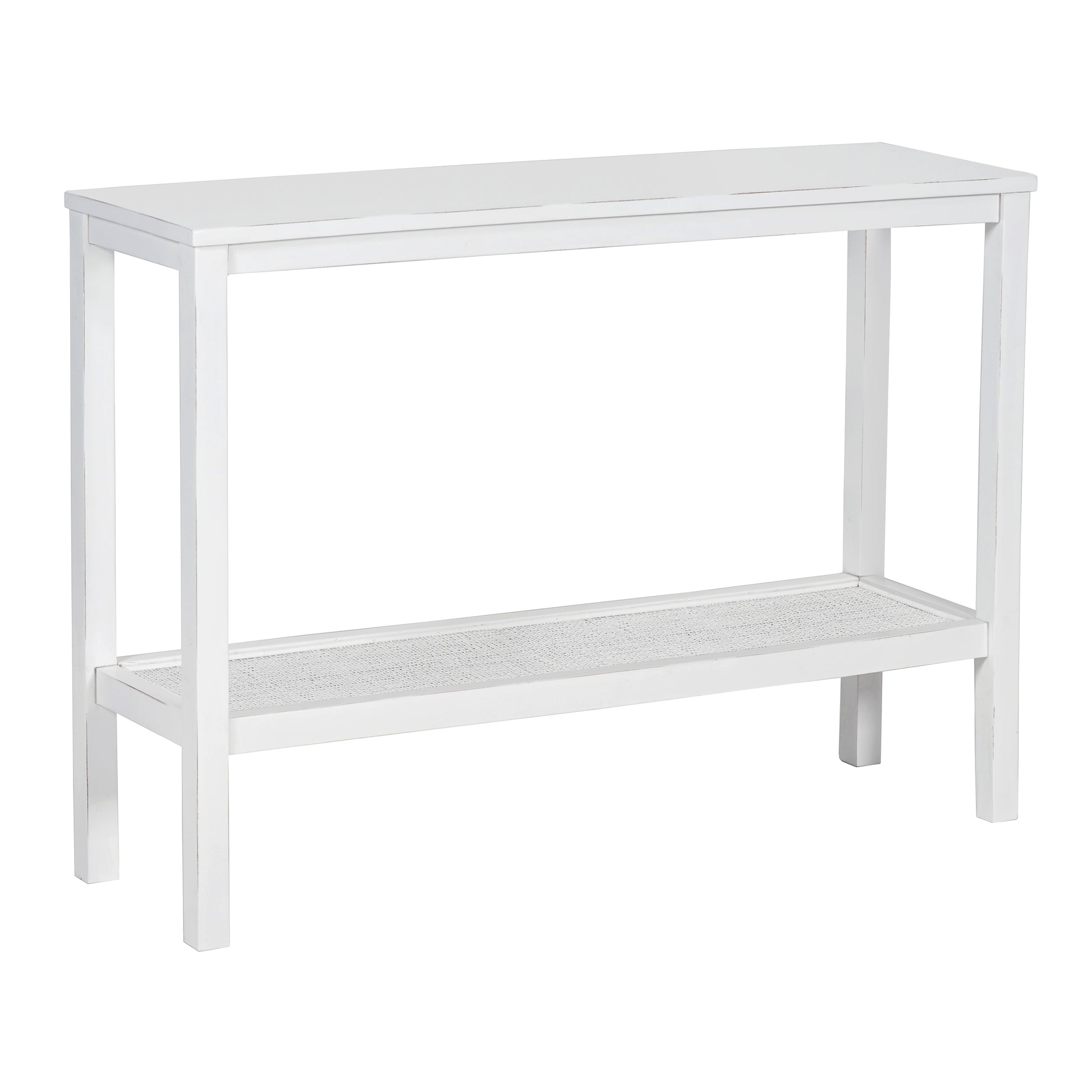 The console table is simply a multi-purpose furniture marvel! It is a table with attractive webbing on the lower part and is made of sustainably harvested solid Mindi wood. The Mindi wood is valued for its strength, longevity, and resistance to deterioration due to mould or moisture.Designed in a Bohemian style, with fibrous whiskers, bumps, slight cracks etc. as natural features, this small piece of furniture brings a sense of coziness and warmth to your living room. The distressed white finish makes this useful table suitable to complement diverse interior decor styles or furniture pieces. The fully assembled table comes with a one-year warranty.