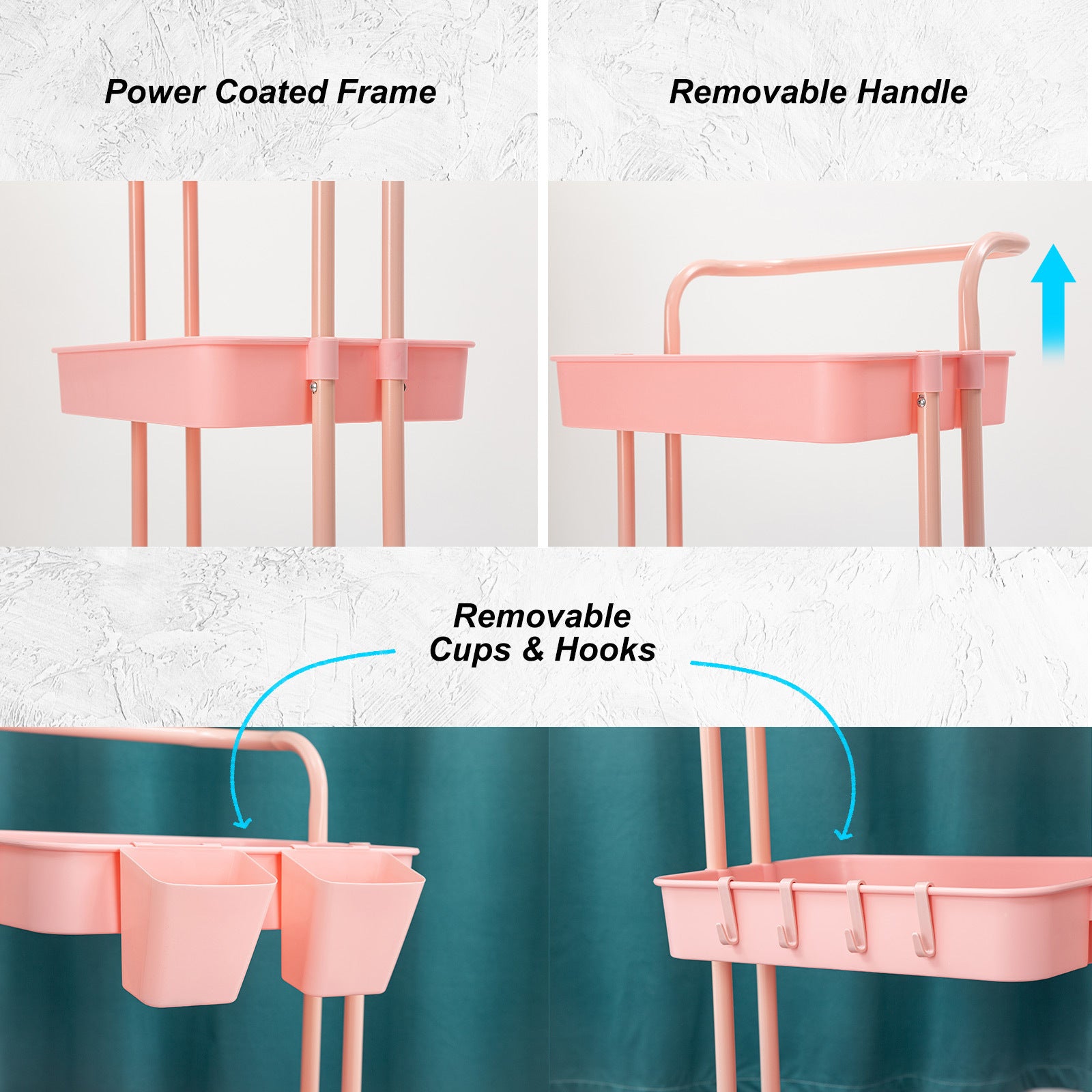 Spacious Storage Capacity: Equipped with removable hooks and hanging cups. Partition to store your various objects, neat and clear at a glance. This kitchen utility cart with wheels provides large storage space while saving you floor space to optimize the space utilization as much as possible; great storage solution for a kitchen, or use it for your pantry, office, garage, laundry supplies, toys, stationeries, or any other multitude of possibilities, etc.
