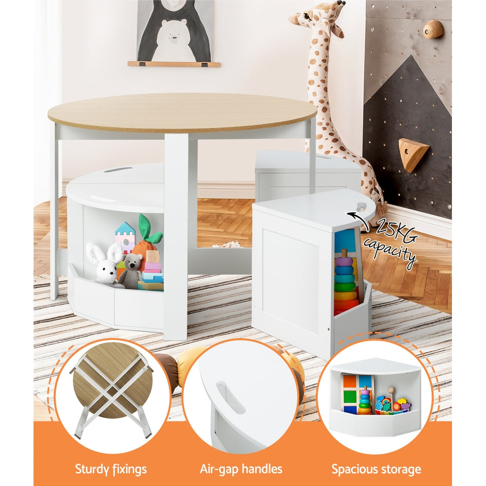 Create a creative zone for your kids to play, create, learn, and eat! Our Keezi kids'5PCS table and chair set makes a perfect nook for your little ones to play, show off their creativity, do homework, and have meals like a grown-up. This gorgeous ensemble is extremely versatile and sure to add a creative touch to your kid's room with its creative integrated design. Featuring a child-safe and convenient design, this set features sturdy MDF board construction for durability and for stability. The eco-friendly and non-toxic paint and smooth round edges make it safe for kids. This set flaunts a space-saving design with round wooden tabletop and white exterior structure and chairs can be completely pushed inwards to save space. The chairs have built-in spacious storage compartments that allows you to store and hide away your kid’s toys, books, and other stuff. Our Keezi kids' table and chair set comes with four chairs and a wide table that allows your kid to play with mates comfortably. They have good weight holding capacity, which makes them extremely safe and versatile to use. Watch your kids have limitless fun and more giggles with their playmates!