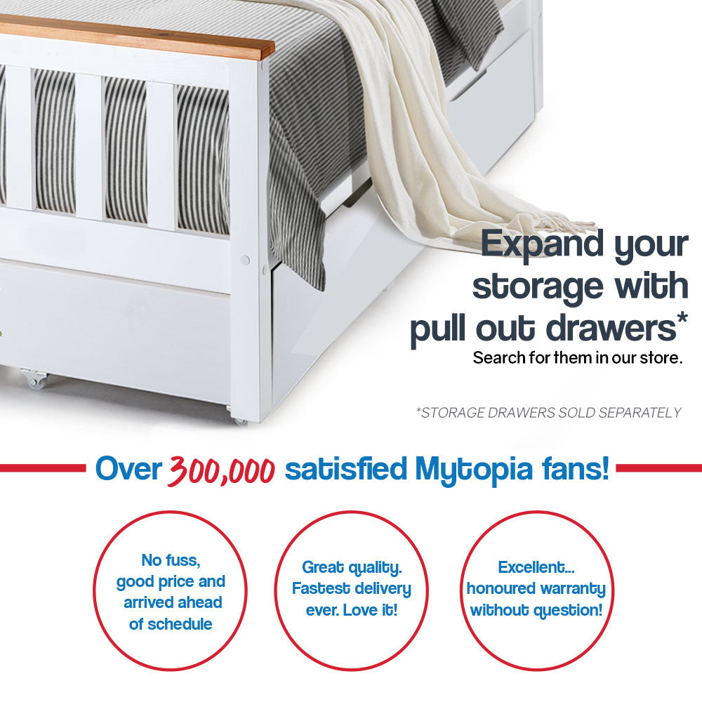 The Kingston Slumber Single Bed Frame and Bonnell Innerspring Mattress set has an all-around functional design that makes it perfect for kids’ bedrooms or guest rooms. With its sturdy natural pine wood frame, this solid bed frame will stand the test of time. The Kingston Slumber Single Wooden Bed Frame has a contemporary classic design in crisp white with teak accents that looks the part in boys or girls bedrooms, or your spare room.