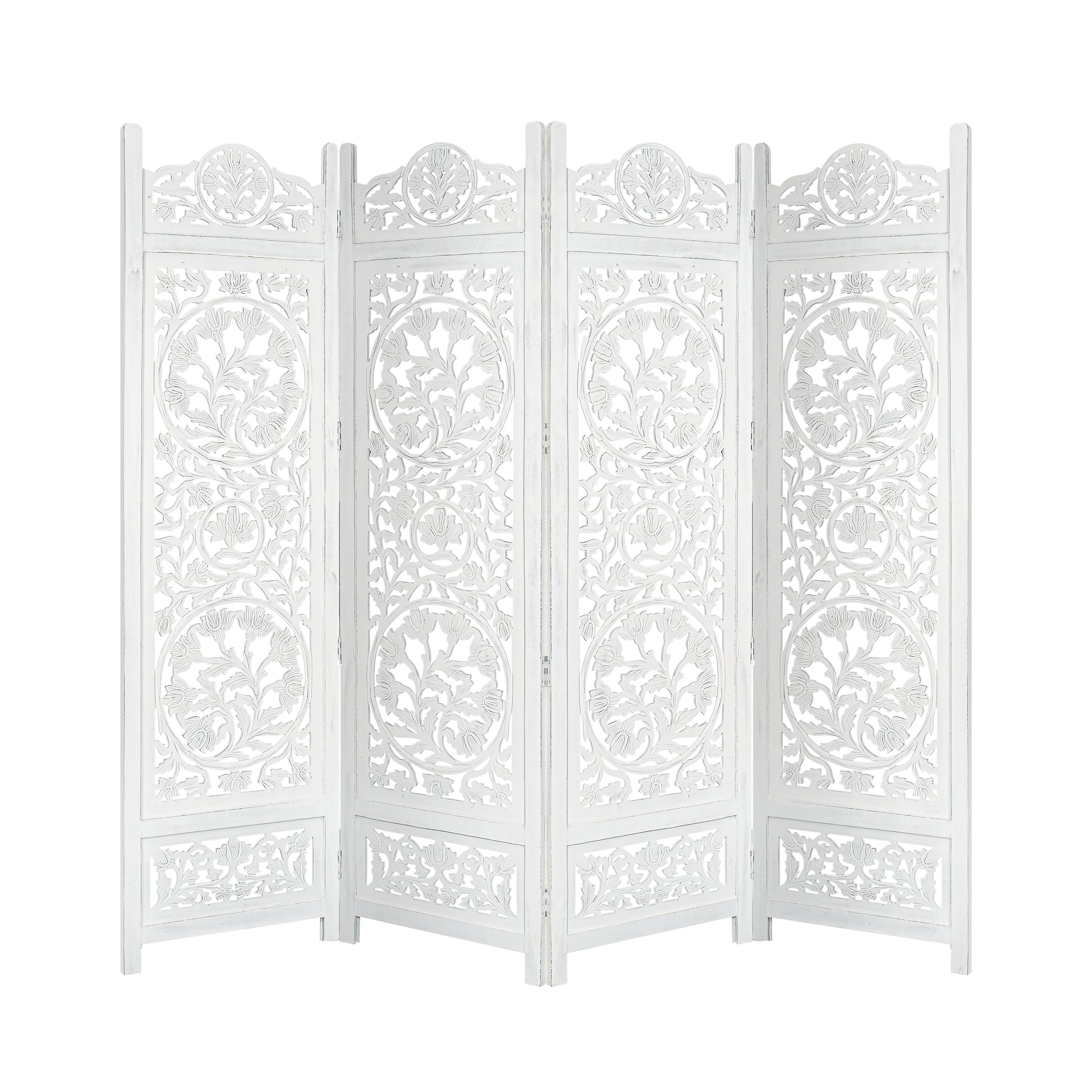 Effectively use the available space in your home with this room divider. The timber screen creates a private space in a room while also adding to its aesthetic appeal. The screen in white antique finish is designed in an exotic pattern using sustainably harvested solid mango wood. This particular wood is well-known for its high water resistance, long durability, and beautiful texture. The traditional style timber screen with strong legs can extend up to 2 metres and serves as both a space-saving and a space-dividing furniture piece. The artistic work on the screen, which includes engraved flower replicas at regular intervals, gives it a stunning appearance, filling the entire area with beauty and positivity. The screen is divided into 4 panels that are easily foldable. Lightweight yet strong, the room divider uses high-performance metal hinges that can withstand daily use. This fully assembled timber screen comes with a one-year warranty.