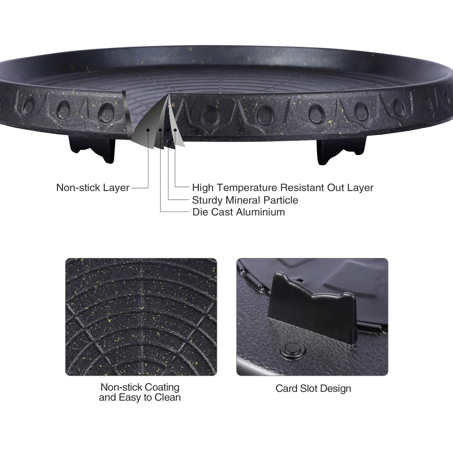 Our round grill pan is made of maifanite surface, Non-stick coating. The bottom is double-layered and thickened aluminum, which is durable and evenly fast heated.