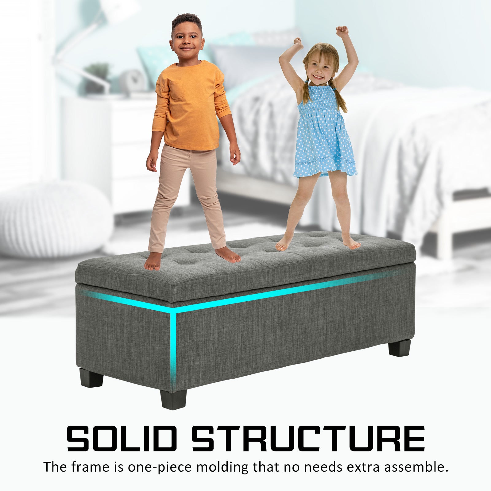 Unlike other cheaper alternatives, our ottoman is made with a solid wooden lid and frame that can take up to 200kg in capacity. We also use genuine rubber legs that protect your floor and are anti-slip too.