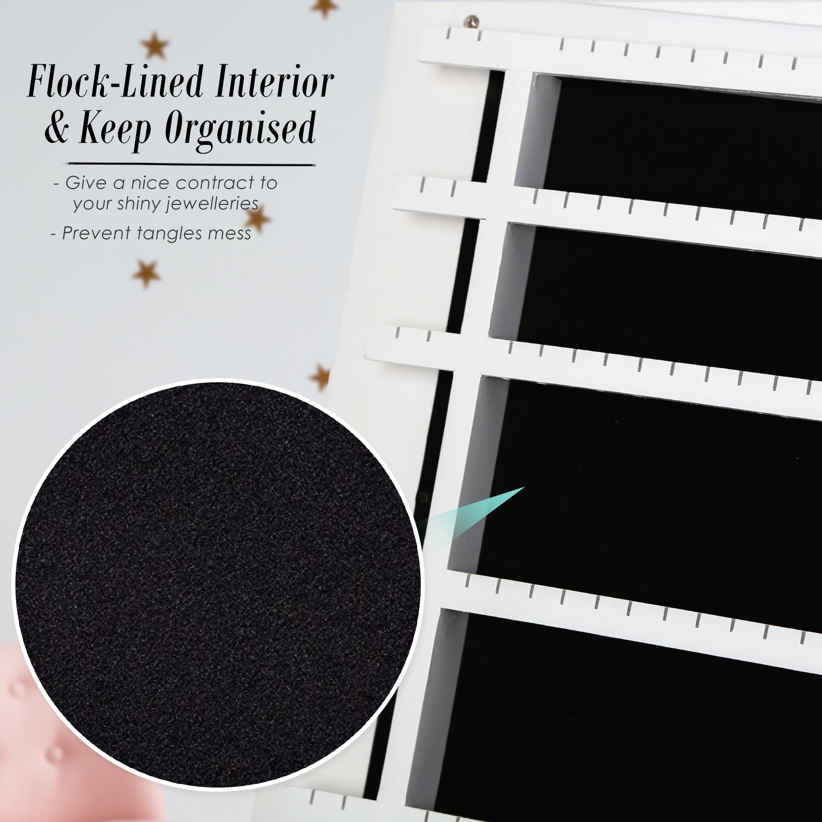 There are many earring hangers, necklace hooks, ring slots, and shelves to make it easier to separate and organise your precious jewelleries. You can certainly find many ways to arrange your accessories so you will be able to find a perfect way only for yourself! The black flock-lined interior will give your shiny jewelleries a nice contrast and under light, it will look even better!