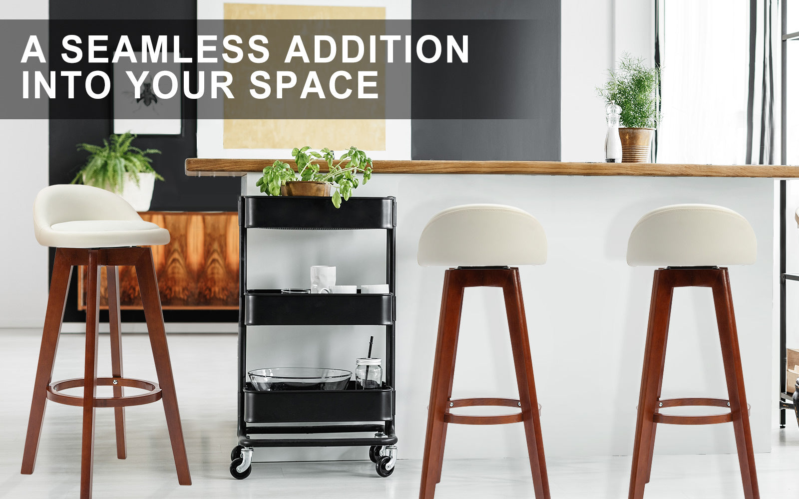 To ensure safety, the legs are tapered outwards to form a slight A-shape, so that the bar stool is well-balanced without occupying too much space. Additionally, the legs are made of solid rubberwood with a circular footrest to ensure extra sturdiness and support. This does not mean comfort is sacrificed as the seat itself is upholstered with PVC leather padding. Installed with a swivel mount plate, the seat will swivel 360� so that you can reach whatever you want, maximising accessibility. Stool legs are also equipped with anti-slip protectors to minimise scratches onto wooden and tile floors. To give you a peace of mind, the bar stool will only take you approximately 9 minutes to assemble.