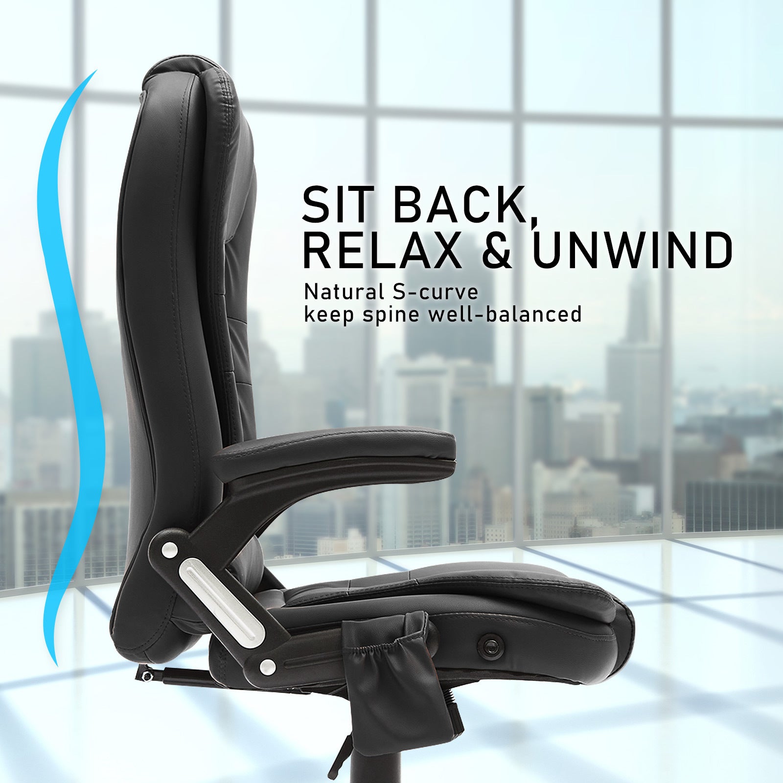 Its clever design conforms to the natural curve of the spine, includes a padded headrest. Plus, its upholstery crafted from premium PU leather with extra lumbar support greatly helps you sit up straight and alleviate pressure on your lower back. In other words, say goodbye to neck and back pain. To add arm comfort, avoid carpal tunnel syndrome, the armrests are made padded and are slightly curved to fit under your desk easily.
