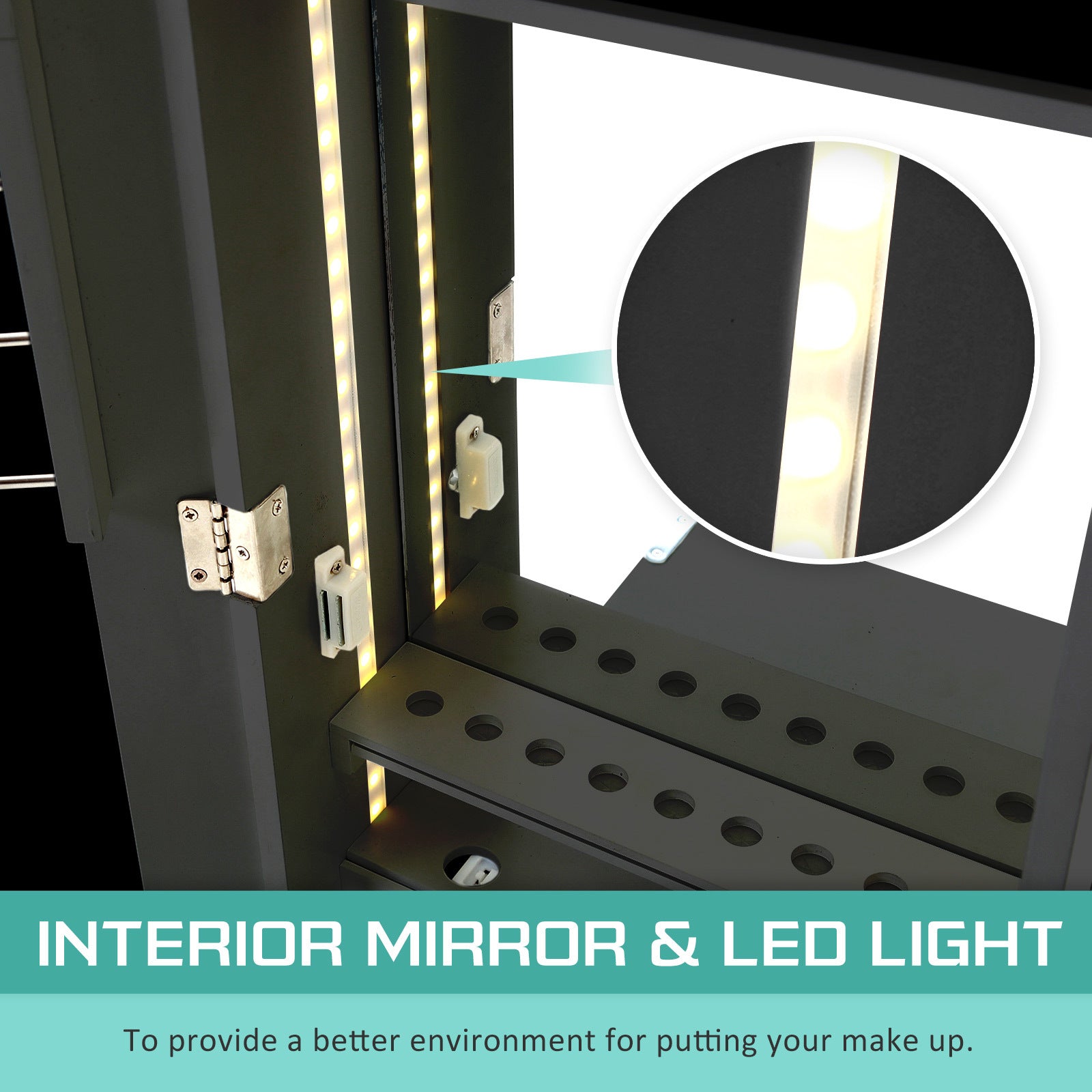 This high-quality La Bella FLASHY edge-to-edge Mirror Jewellery Cabinet is ideal for you if you need a compact and stylish storage option for your precious accessories! The edge-to-edge mirror is a full-length dressing mirror so you can enjoy the convenience of having a mirror instantly available to check out how great your jewelleries fit with your dressing! It features a modern LED light so that you could make up with no drama. It will blend in well in any room and this is for sure a great solution if you want to keep your jewelleries and room tidy.