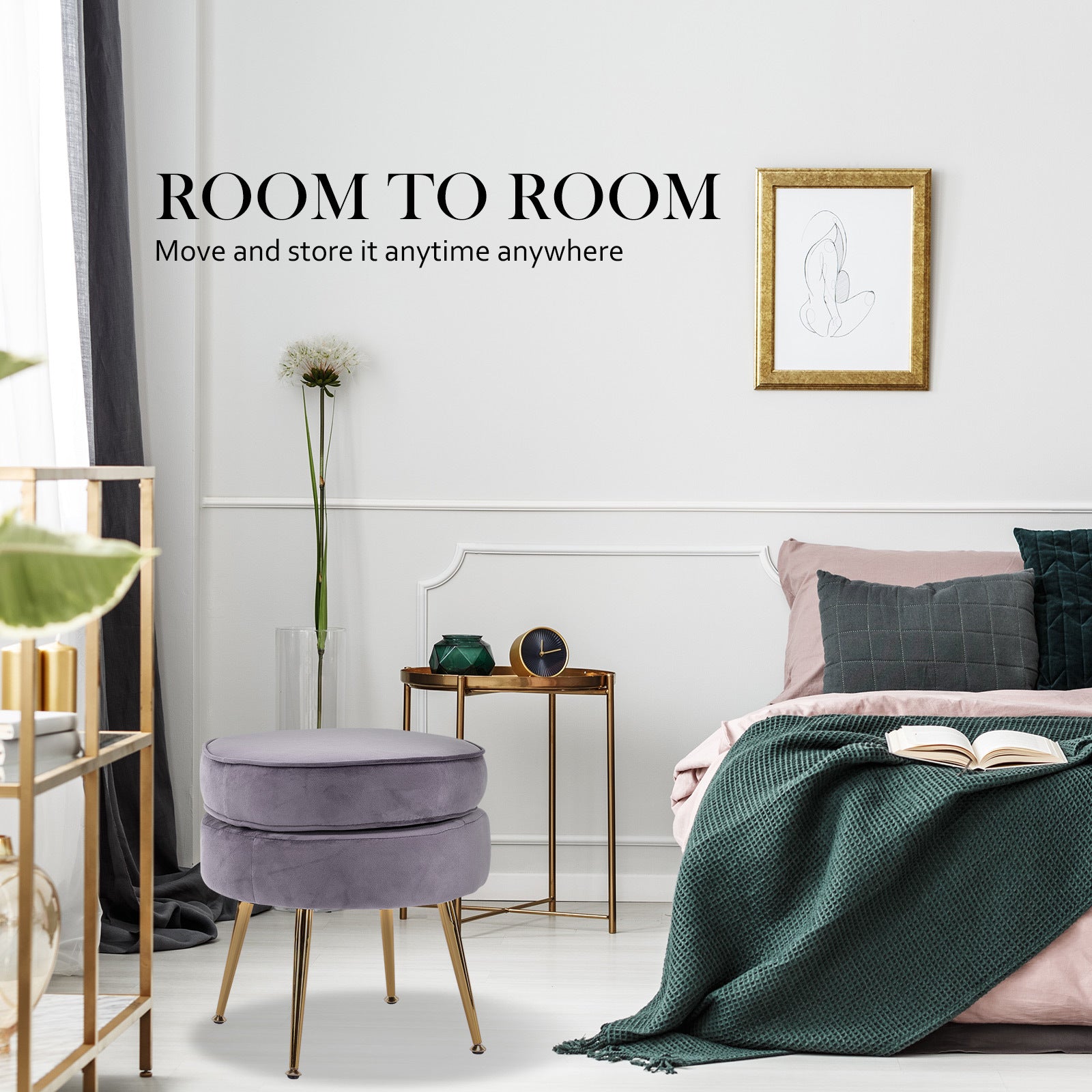 La Bella Grey Round Ottoman Foot Stool Velvet Fabric Metal Leg