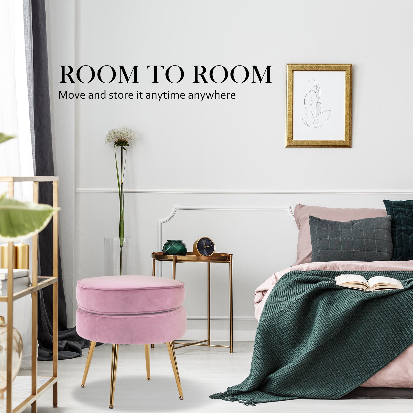 La Bella Pink Round Ottoman Foot Stool Velvet Fabric Metal Leg