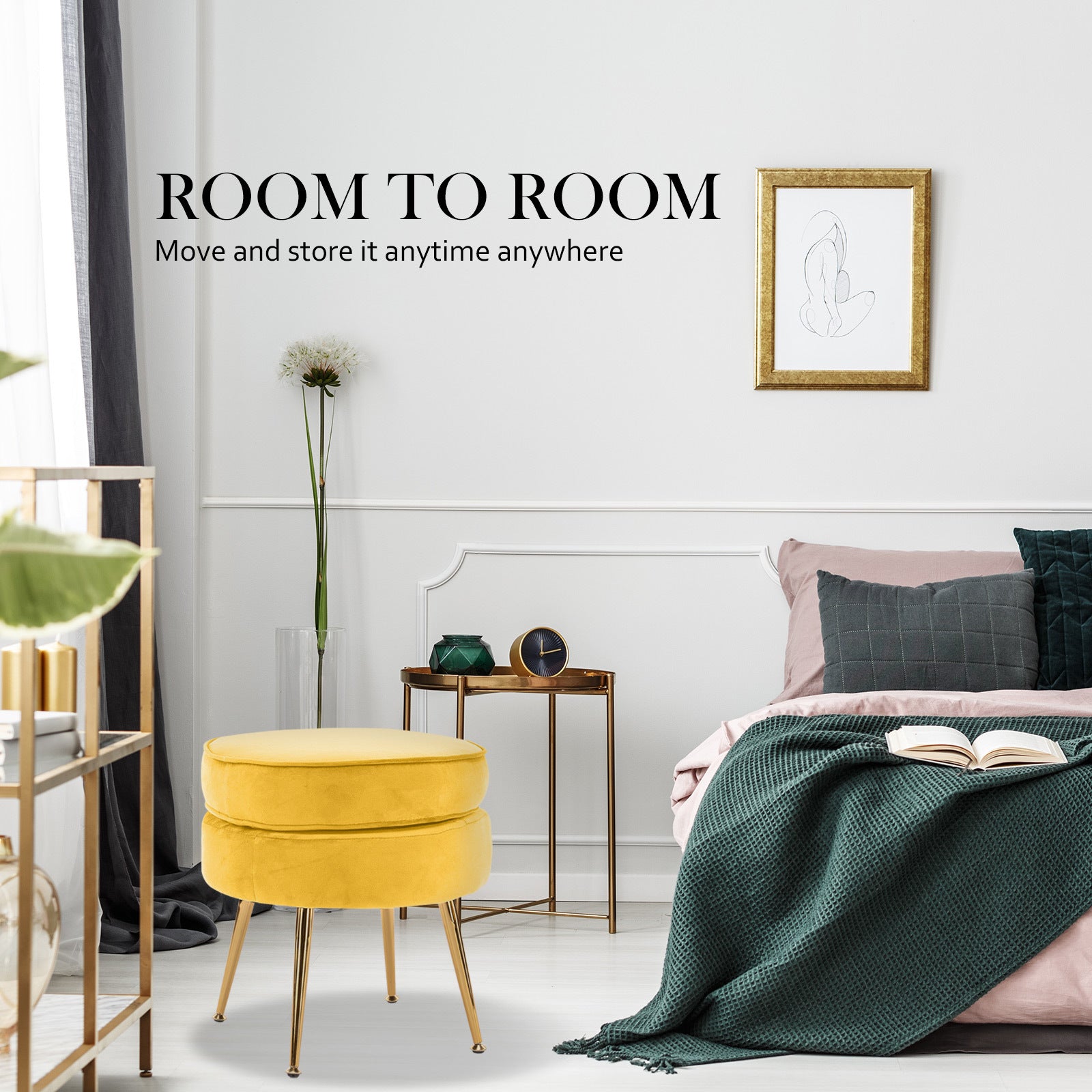 La Bella Yellow Round Ottoman Foot Stool Velvet Fabric Metal Leg