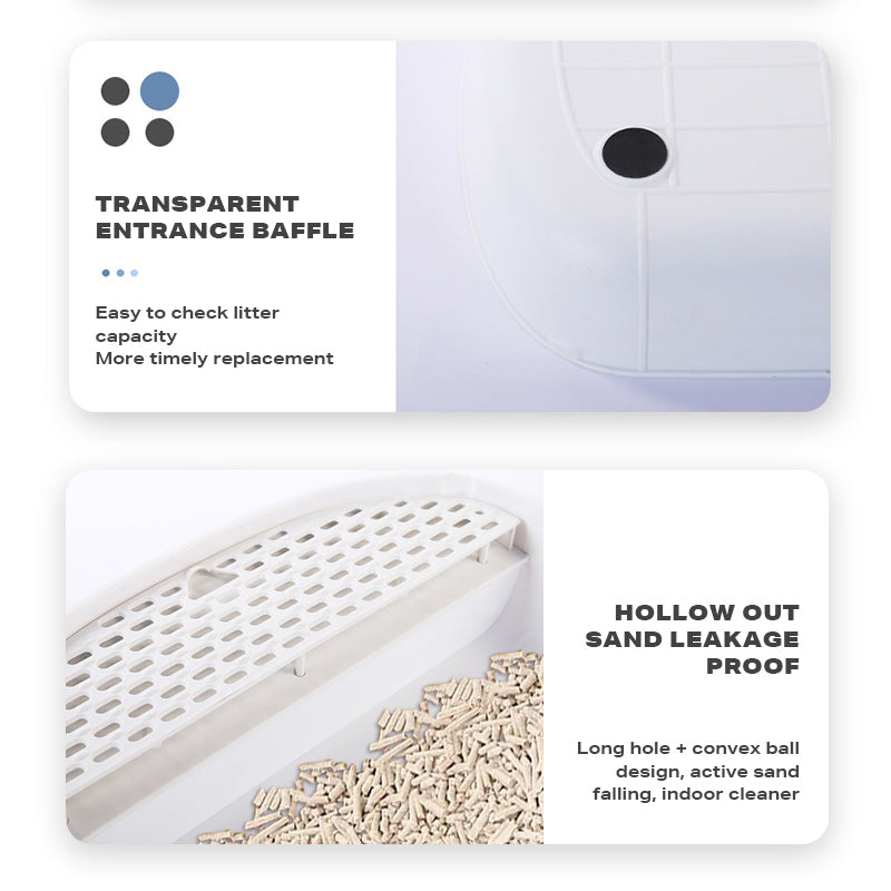 - One-Way Door: The front door of the litter box is only used for in and out, to prevent the litter spill outside, the cat could go in and out through the top door at will, which is benefitial to exercising the cat's body and increasing the fun of life. The hollow holes at the top of the litter tray filter the litter, so that when the cat jumps out the litter will fall back into the tray without causing a mess and reducing the number of cleanings.