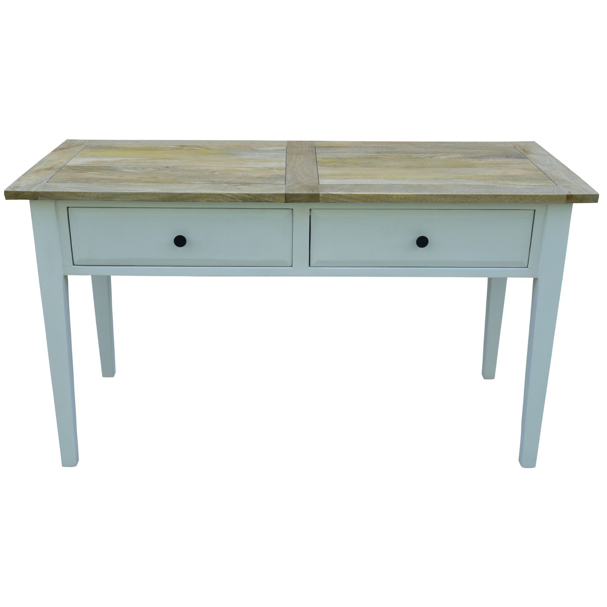 This beautiful console table gives your living room the perfection it deserves. With 2 sizable drawers, it offers great functionality. Both the drawers have full-extension metal runners, black metal handles, and white painted interiors. Designed beautifully, the multi-coloured table features a lightly stained natural timber tabletop contrasted with a white painted base. The two-tone range looks gorgeous in a variety of interior decor styles. Designed by using the elements of a combination of styles, including Hampton, Coastal, Modern Farmhouse, and French Provincial, the table exudes perfection effortlessly. It is made of sustainably harvested, solid mango wood using traditional construction techniques that ensure perfect cuts and an impeccable shape to suit your taste. The wood makes the table strong and durable while providing water and heat resistance. A one-year warranty is included with the easy-to-assemble console table.