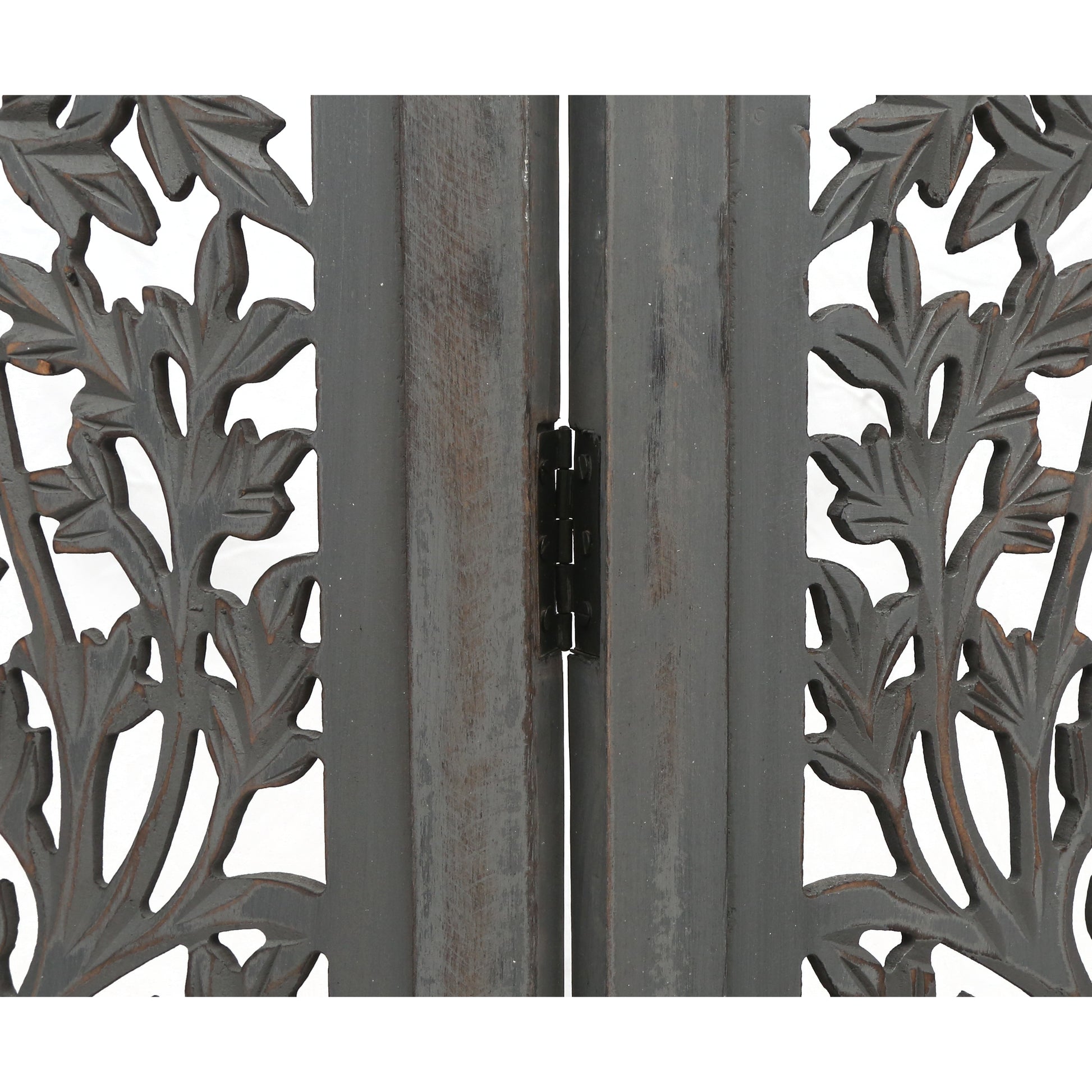 Effectively use the available space in your home with this room divider. The timber screen creates a private space in a room while also adding to its aesthetic appeal. The dark grey colour screen is designed in an exotic pattern using sustainably harvested solid mango wood. This particular wood is well-known for its high water resistance, long durability, and beautiful texture. The traditional style timber screen with strong legs can extend up to 1.8 metres and serves as both a space-saving and a space-dividing furniture piece. The artistic work on the screen, which includes engraved tree and leaf replicas at regular intervals, and a curvy top give it a beautiful appearance, filling the entire area with positivity. The screen is divided into 4 panels that are easily foldable. Lightweight yet strong, the room divider uses high-performance metal hinges that can withstand daily use. This fully assembled timber screen comes with a one-year warranty.