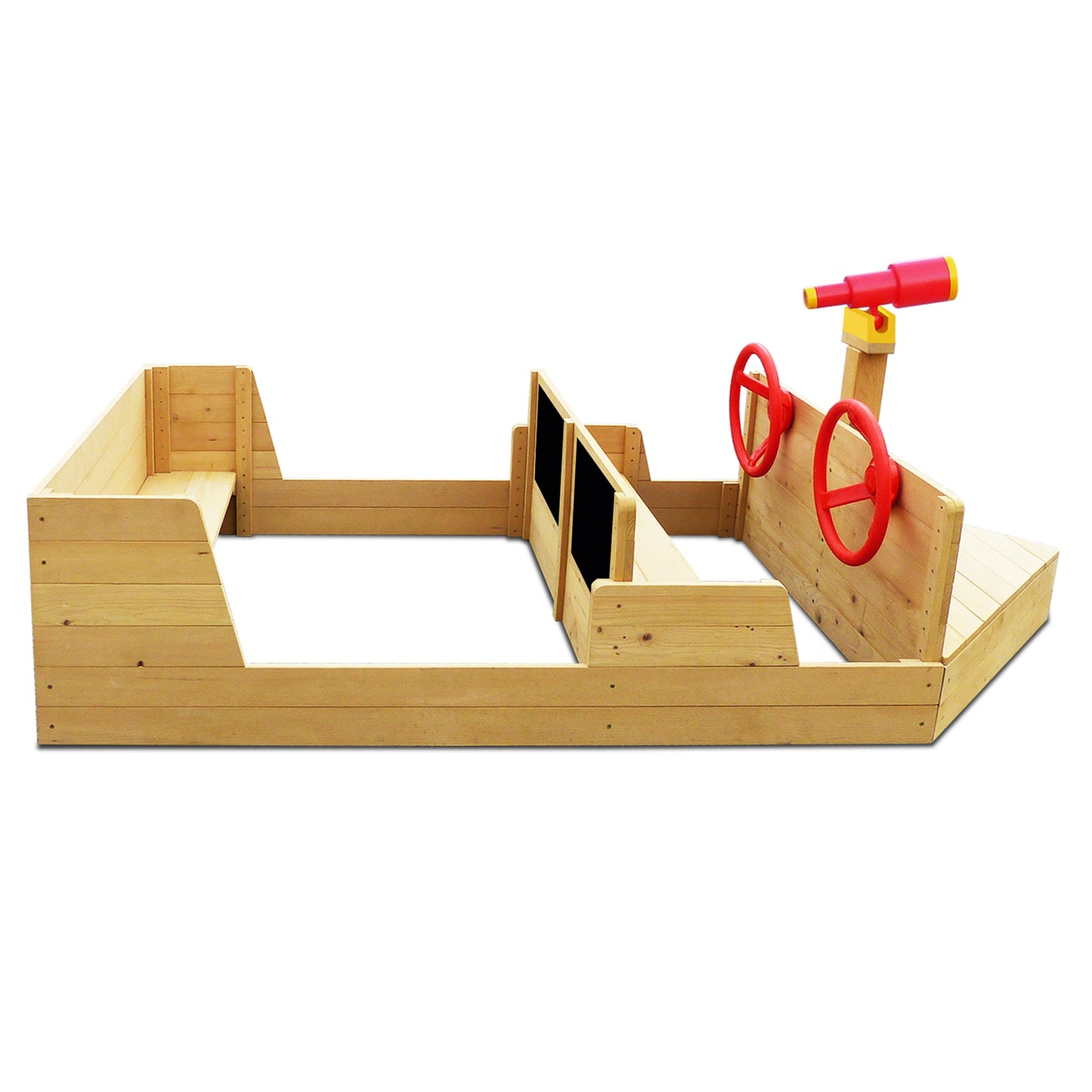 Get your sea legs ready, we're leaving port in the Admiral Play Boat! Little Admirals will command the seven seas at the helm of this vessel with 2 steering wheels, and a mounted telescope. Unlock their imagination with a chalkboard, ball or sandpit, and front compartment for toy storage.