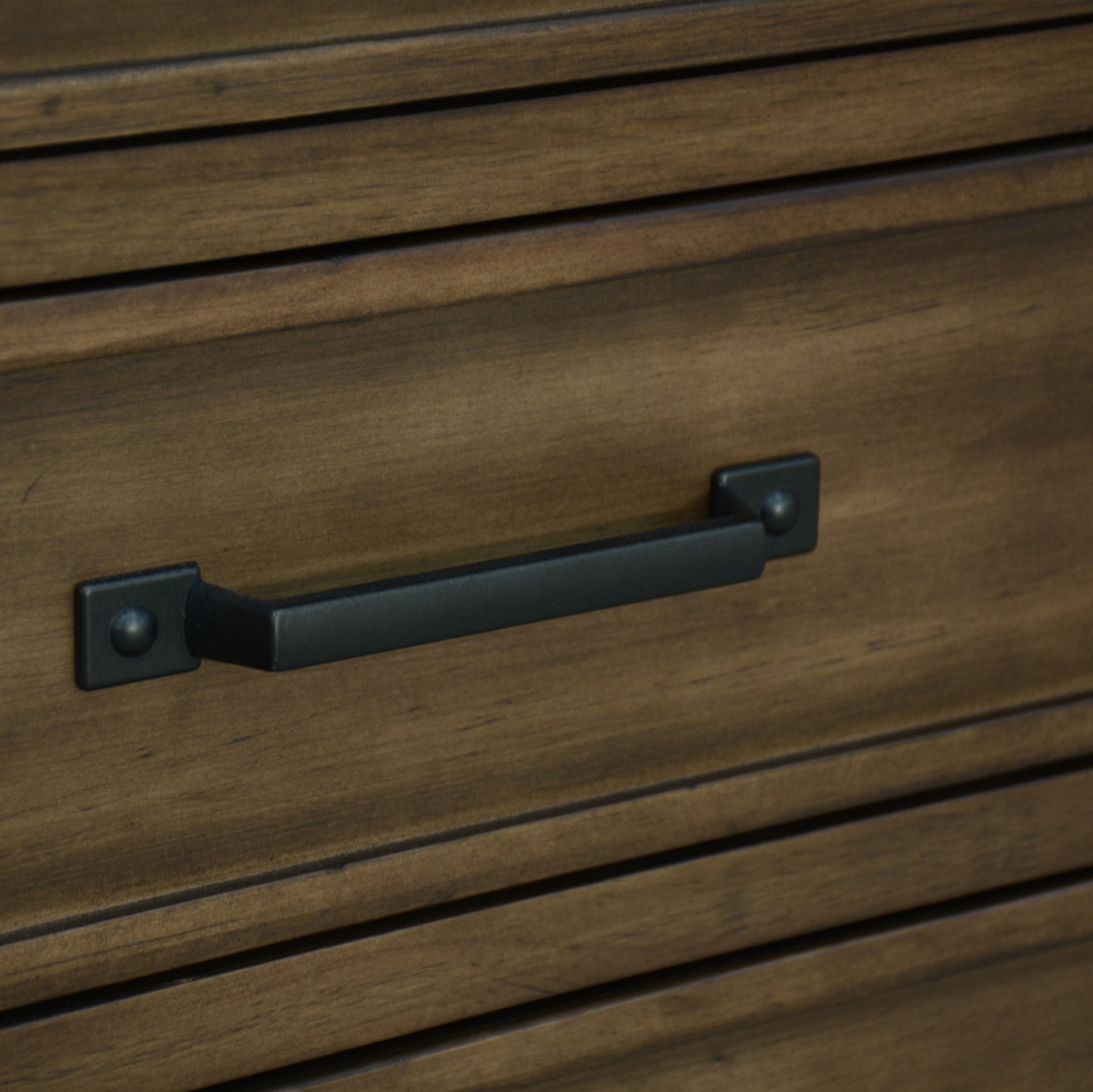 - Metal handles on drawers with an antiqued finish